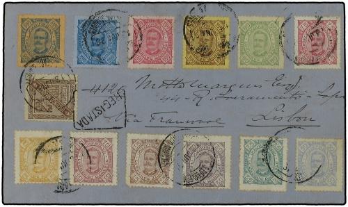 1896 (June) Registered cover endorsed ´Via Transvaal´ bearing Lourenco Marques 1893 Newspaper stamp 2½r. Brown and 1895 complete set 5r.-300r. All tied by Lourenco Marques cds´s. Lisbon arrival (July 9) on reverse of scarce and colourful cover. Scott 1-12,P1.