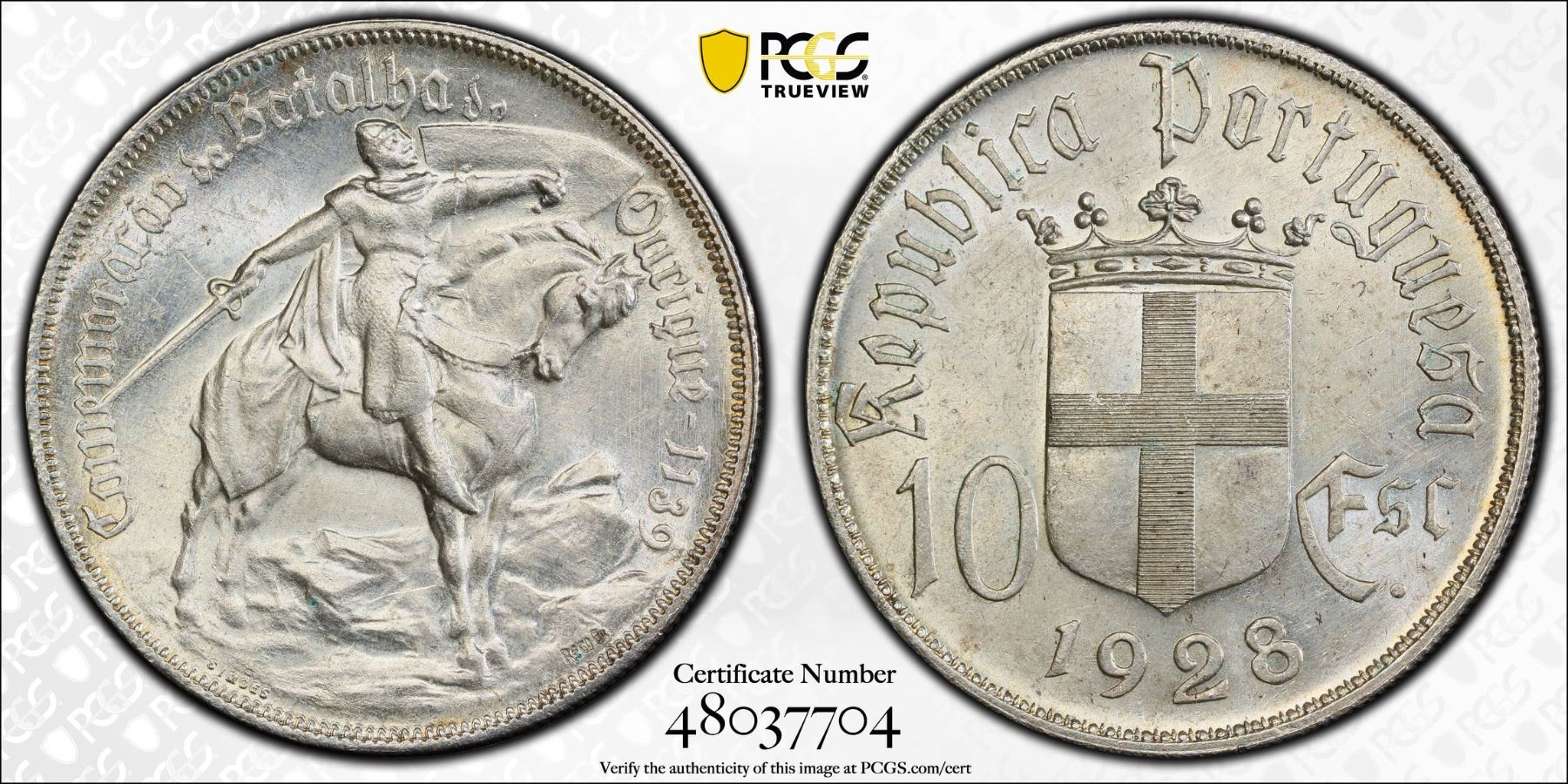 PORTUGAL: Republic, AR 10 escudos, 1928, KM-579, Y-56, Battle of Ourique, lightly cleaned, but still lustrous, PCGS graded UNC details