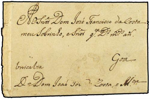 1752 (3-Abril) LISBOA a GOA (India Portuguesa). Envuelta de carta con el texto completo enviada a D. Jose Francisco da Costa, indicación manuscrita en anverso "Unica Via". Pieza excepcional, una de las cartas mas antiguas conocidas dirigida a la India Portuguesa.