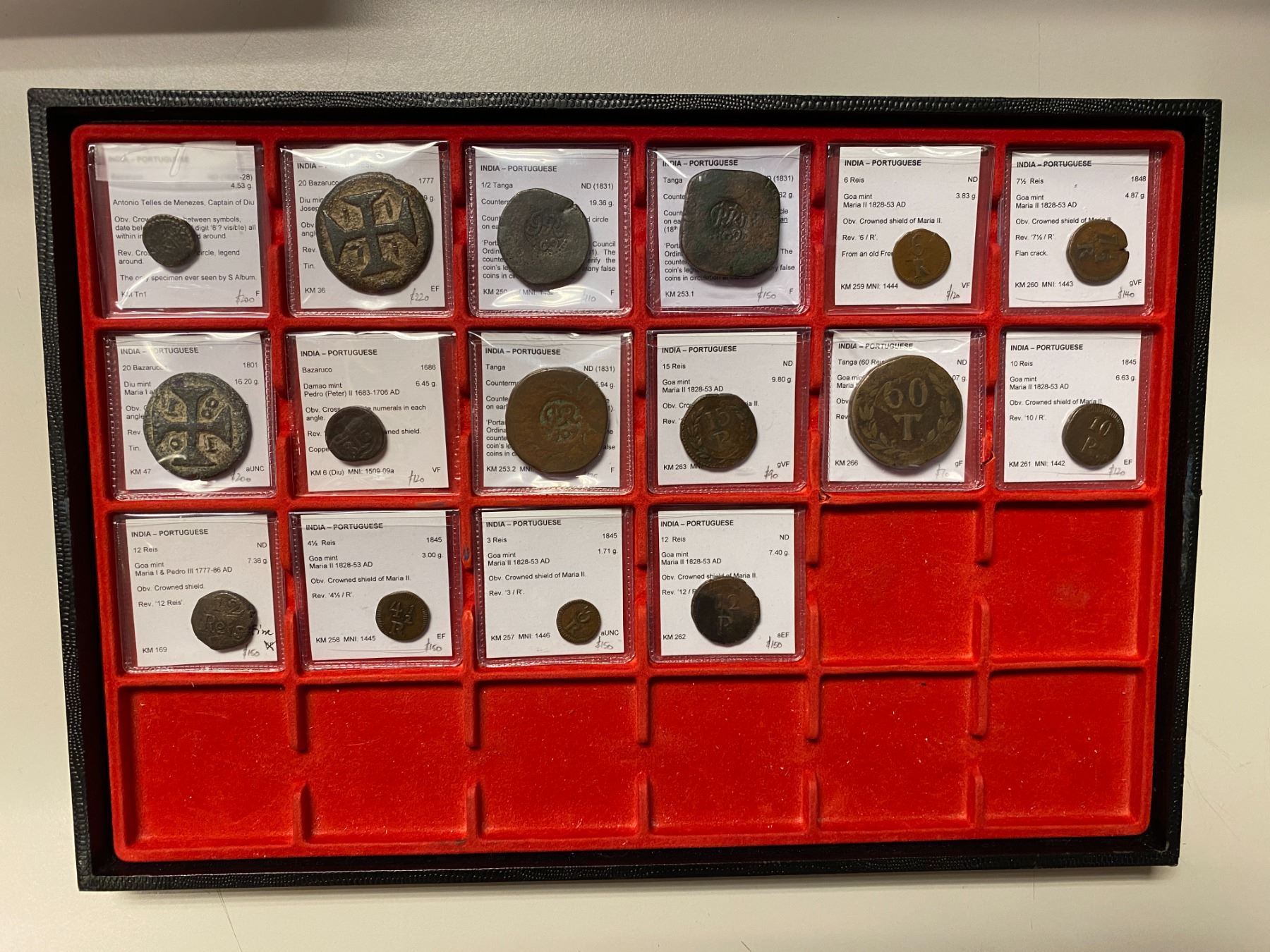 PORTUGUESE INDIA: LOT of 16 base metal coins (copper unless otherwise noted) Goa:KM-169 (12 reis ND), KM-257 (3 reis 1845), KM-258 (4-1/2 reis 1845), KM-259 (6 reis, undated), KM-260 (7-1/2 reis 1848), KM-261 (10 reis 1845), KM-262 (12 reis, undated), KM-263 (15 reis, undated), and KM-266 (60 reis, aka one tanga, undated); Diu: KM-Tn1, bazaruco of Antonio Telles, undated), KM-36, tutenag 20 bazarucos 1777 (EF), and KM-47, tutenag 20 bazarucos 1801 (EF); Damao: KM-6 (bazaruco 1686, filed under Diu by KM); and Countermarked coins of Goa: KM-250 (1/2 tanga), KM-253.1 (tanga), and KM-253.2 (tanga); average VF condition; with Ian Todd's description; retail value $650, lot of 16 pieces.