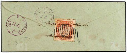 2II 1871 MARGAO a PANGIM. 20 reis rojo PAPEL ESPESO, impresión muy fina. MAGNIFICO Y MUY RARO. Cert. A.C.D.P.