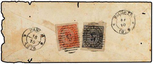 AF.26,28 1876 PANGIM a MARGAO. 10 reis negro y 20 reis rojo. Muy raro franqueo con el pago previo de los 10 reis del reparto a domicilio.