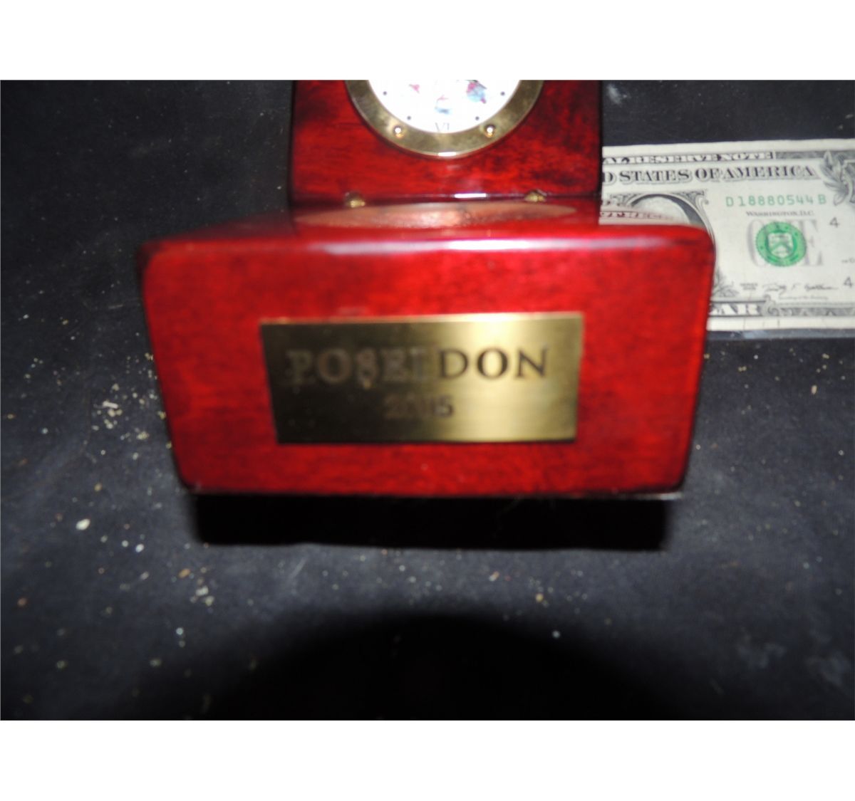 This is a Producers gift from POSEIDON. It is a clock and compass in a wood case with plaque.