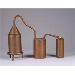 POSSIBLE PATENT MODEL FOR STILL. No patent tag. Two-piece brass model for still, consisting of cylindrical tank on three feet connected via a funnel and tube to another cylindrical tank, terminating via another coiled tube surrounded by another smaller cylindrical tank. SIZE: 9-1/2" w x 7-1/4" h. CONDITION: Appears very good. 1-3182 (40-60)