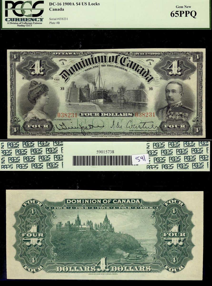 POSSIBLY THE FINEST KNOWN! 1900 $4 DC-16 #038231 PCGS Gem UNC65PPQ. This is by far the nicest example ever seen and handled by TCNC. An amazing bright with vibrant colours and very well centered. Do not miss this ONCE-IN-A-LIFETIME opportunity to acquire this unbelievable rarity! A killer! Of the highest rarity! Worth a premium bid. despite all catalogues and expect strong bidding on this one.