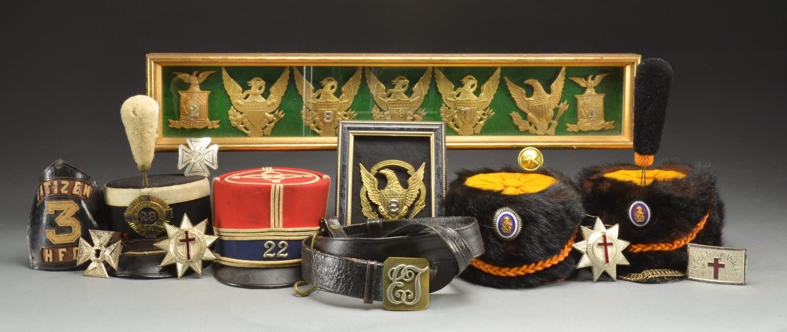 POMSPOMS & MORE. This lg. & varied group includes 2 fur mounted cavalry hats dating to about 1900 by Ridabock & Company of New York. Front plates feature red, white & blue enamel w/ a horse’s head over “ET”. / 1 Militia hat for the 22nd New York by Ridabock & Co. of NY. Hat is red & blue & features a white chinstrap & trim. / 1 Militia hat for the 23rd NY National Guard by Ridabock & Co. of NY. Hat is black w/ white trim & a leather chinstrap. / 2 Rolls of white cotton belt material. / 1 Pair of naval shoulder straps. / 1 Box of 3 medals including a Marine Corps Good Conduct medal, a Marine Corps Expeditionary medal & a WWI Victory medal. / 7 Hat plumes in cardboard tubes. / 1 Yellow hat cord & 1 yellow aiguillette from about 1900. / 1 Leather sling & clips. / 1 Box containing 13 hat visor brims. / 1 Bag containing 9 pompoms. / 1 Sm. bag containing about 25 star side buttons for chinstraps. / 1 Lg. bag of hair plumes for Indian War to WWI headgear. / 1 Bag of Masonic belt buckles & crossbelt pins. / 1 Pirate flag. / 1 Militia sword belt having an 1890’s period ET belt buckle. / 2 Different 1820-1840 silver epaulettes. / 1 WWI sword knot. / 5 M1866 naval insignia. / 6 Militia 1880 chevrons. / 2 Infantry captains shoulder straps. / 1 Miniature canteen. / 3 Bullion infantry horns. / 1 Canteen stopper. / 1 Frame containing an M1881 infantry helmet eagle. / 1 Lg. frame containing 5 M1881 helmet eagles & 2 NY helmet plates. / 1 Sm. 3 tier glass & metal display case. CONDITION: most items show light to moderate wear except as noted. (02-14460-2/BF). $800-1,200.