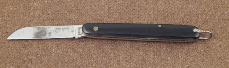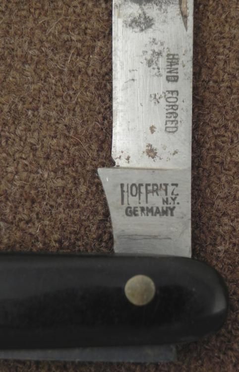 OFFERED HERE IS A POST-NAZI WWII GERMAN IMPORT FOLDING KNIFE. DARK THE KNIFE HAS BAKELITE GRIPS WITH A BOTTOM LOOP. IT IS MARKED:HOFFRITZ-NY-GERMANY-HAND FORGED AND IS 6 1/4" OPENED. *