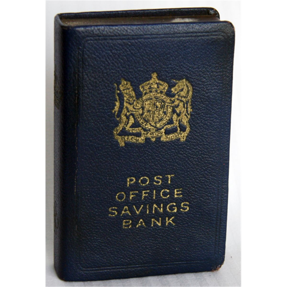 POST OFFICE SAVINGS BANK. Coin lot and currency hole on bottom. Key lock. No key present. Serial number 298865. Black cloth or leatherette cover, with gilt lettering and Canadian coat of arms impressed. 8cm x 12cm x 2cm. Maker unknown. No patent information. VF+.