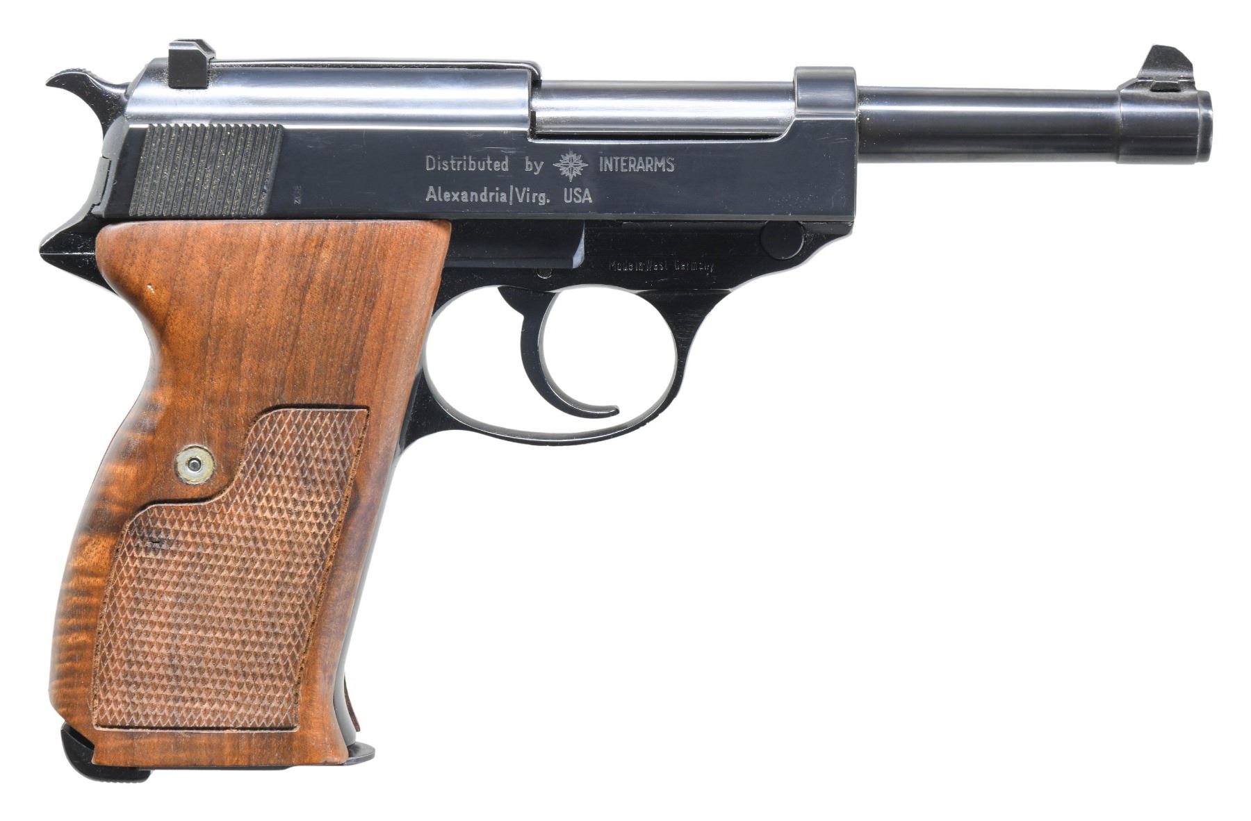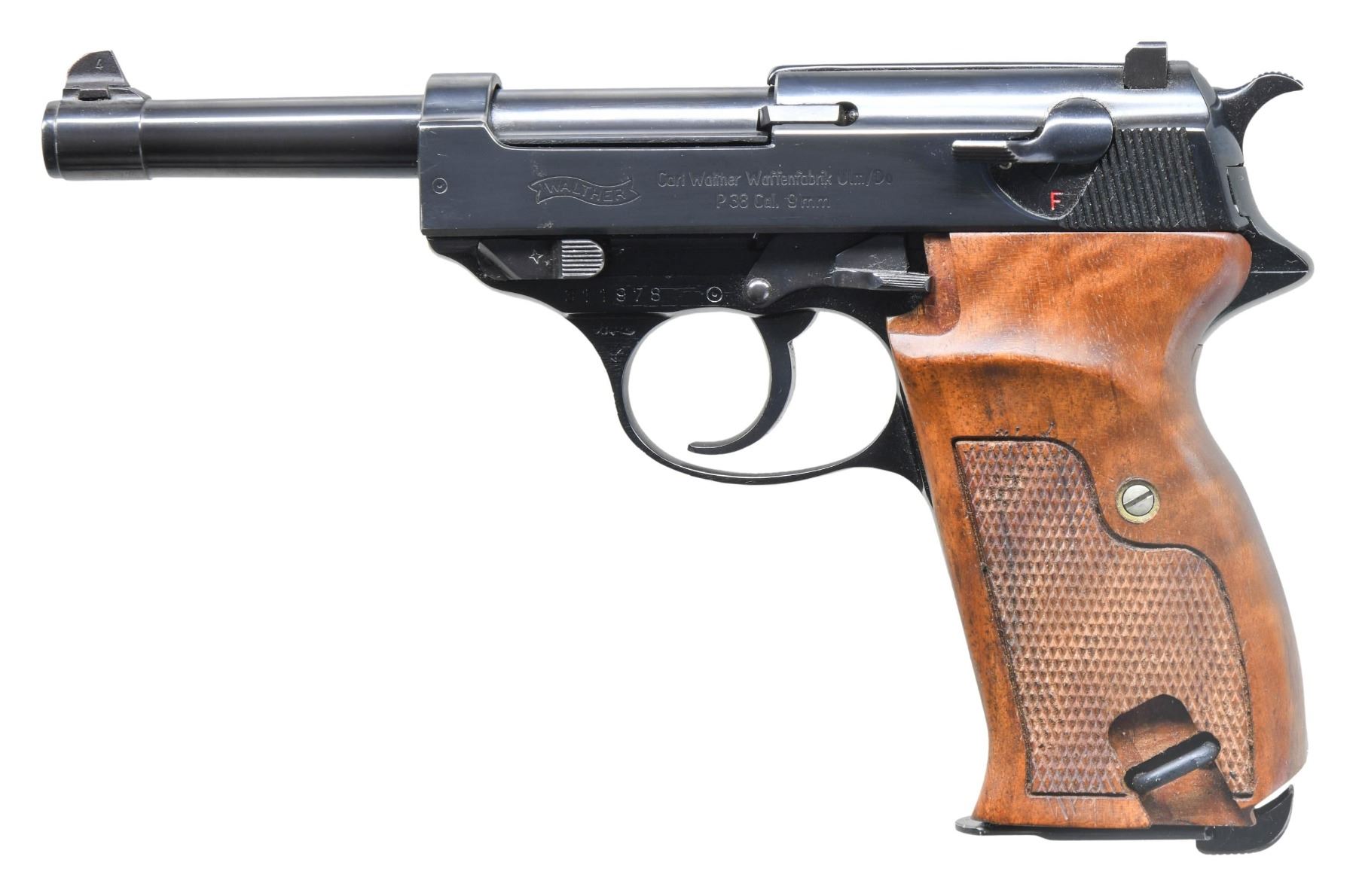 1) HIGH CONDITION POST-WAR WALTHER P.38. Cal. 9x19mm. S# 311978. Bbl. 4 7/8". Model P.38 semi-automatic pistol mfg. in West Germany by Walther in 1968 and subsequently imported by Interarms. Left side of slide with Walther banner logo and standard factory markings, with Interarms importer information marked on the right. Left side of the forward trigger guard web is stamped with the 2-digit year of mfg. "68", followed by an Ulm Proof House antler above an Eagle/N proof. Alloy frame exhibits a black anodized finish, with the slide and bbl. exhibiting a blue finish. Frame is mounted with 2-piece checkered wood grips. Standard dovetailed blade front sight with U-notch rear sight. All serialized parts are matching and include the frame and bbl. MAGS: 1 blued 8-rd. with 7 transverse indicator holes. CONDITION: excellent, with metal components showing some spots of light edge wear and some light superficial handling marks. Mirror bore exhibiting some grease while retaining well defined rifling throughout. Proper manual mechanics, including the safety / decocking lever. Grips show some superficial handling marks and wear to the checkering with some checkering overrun on both panels. (25-4667/MLW). 2) CZECH CZ-82. Cal. 9x18 Mak. S# 120594. Bbl. 3 3/4". Standard CZ-82 sights. Matching numbers on slide & bbl. Right side of frame has Czech "she89" acceptance stamp for 1989. Left side of slide has PW Arms import marking. Black enamel finish. Checkered black grips. MAGS: 1-12 rd. CONDITION: grips show scattered handling marks, scratches & checkering wear. Metal retains 85% arsenal black enamel finish with scattered flaking. Action functions properly when hand cycled. Very good bright polygonal rifled bore with some dried grease. (25-4690/MJC). ALL CURIO. $650-1,000.