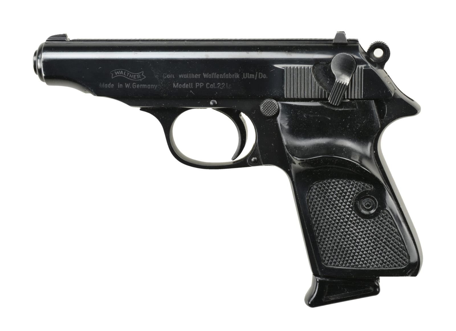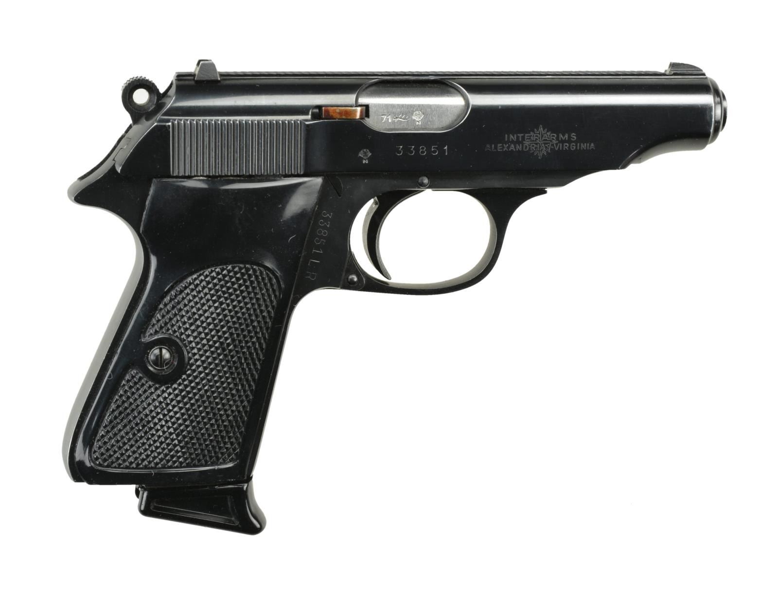 Cal. 22 LR. S# 33851LR. Bbl. 3.9". An Interarms imported German manufactured Walther PP chambered in .22 LR. Traditional double action. Deep blued finish on slide w/ matte black frame. Weave serrated flat top on slide w/ fixed sights. Left side decocker / safety. Serrated hammer spur. Left side mag. release. Black plastic checkered grips w/ thumb shelf on left side. MAGS: factory 10 rd. CONDITION: finish is complete & consistent w/ light thinning in areas of mechanical interaction. Slide appears to have been refinished. Grips demonstrate some gentle wear. Bore is bright w/ strong rifling. Fire control mechanism appears to function correctly when cycled by hand. (22-3046/JZ). CURIO. $700-900.