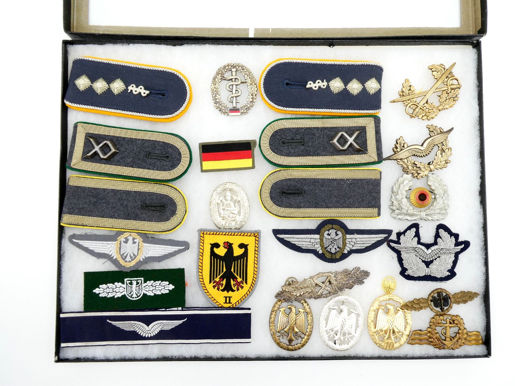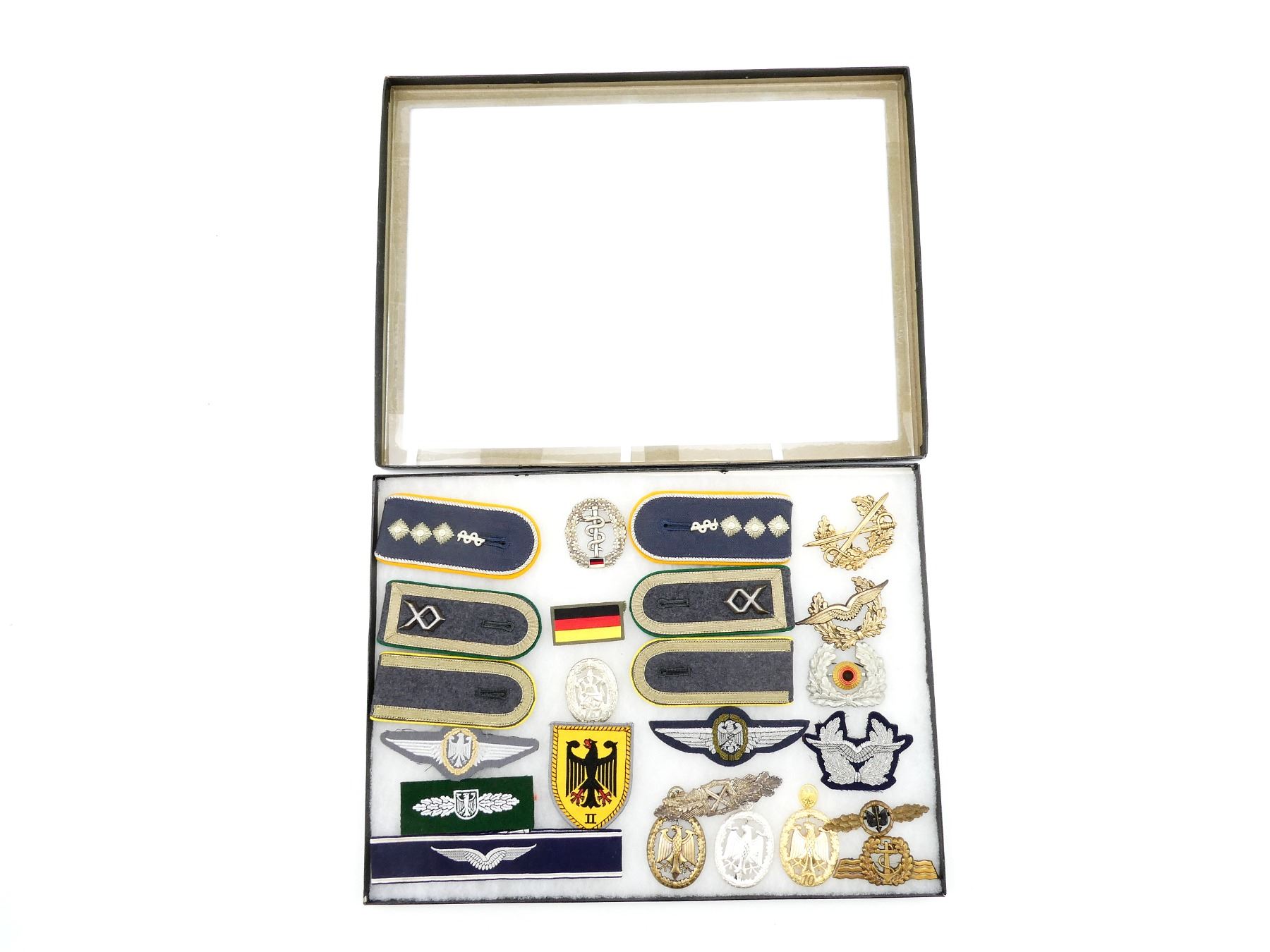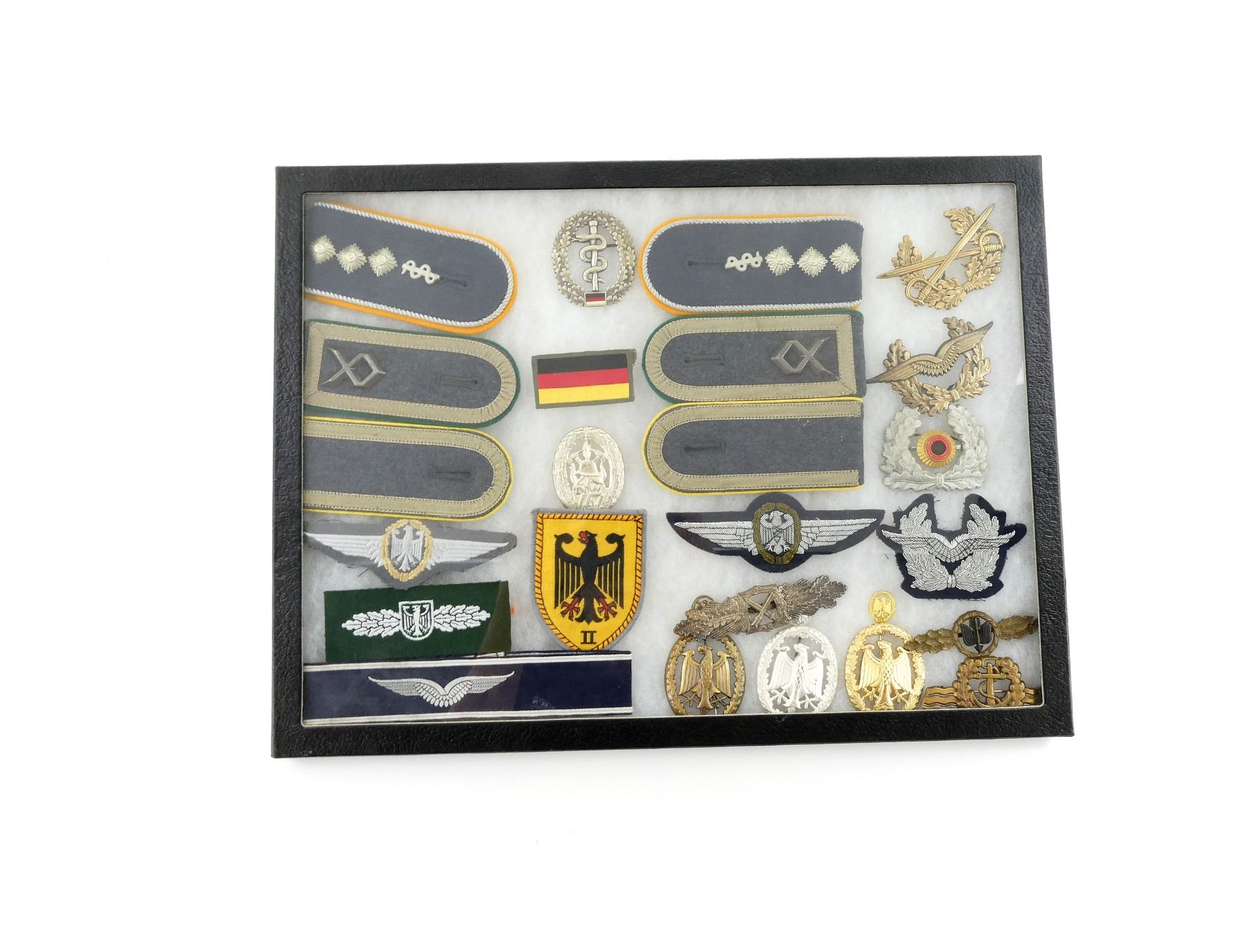POST-WWII GERMAN BUNDESWEHR SHOULDER BOARDS, BADGES, ETC. IN DISPLAY CASE LOT