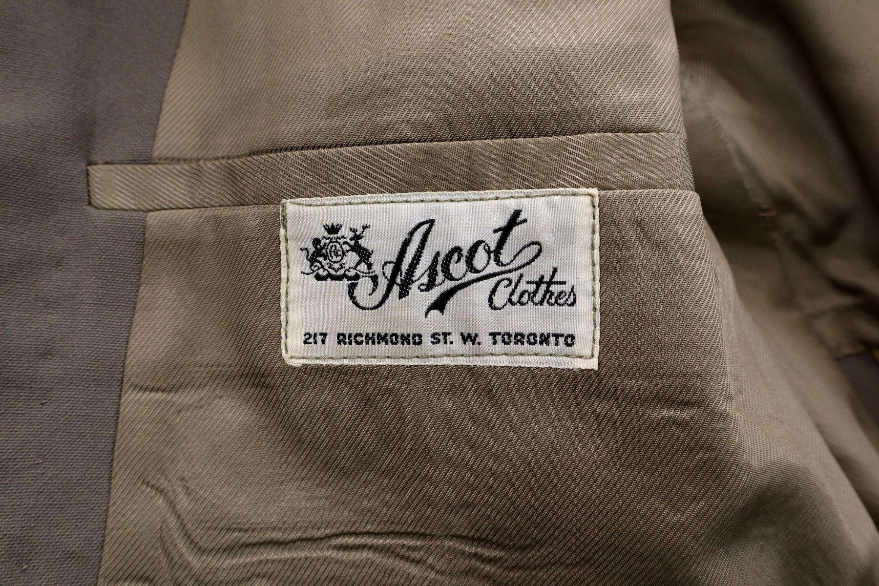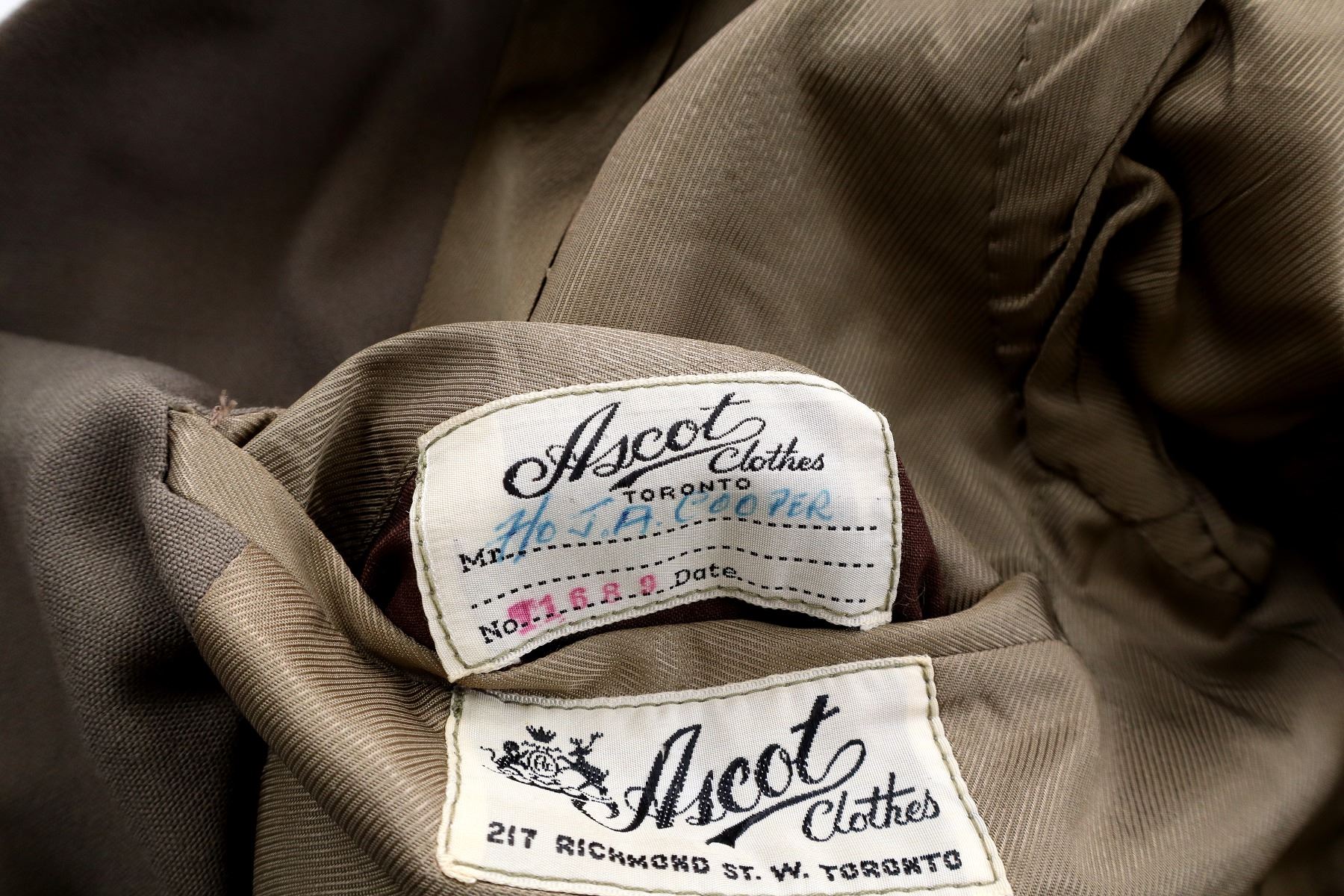 (1) KHAKI TUNIC, MARKED: "ASCOT CLOTHES, MR. ?? J.A. COOPER, NO. 71689", CANADA SHOULDER BADGES, FLIGHT LIEUTENANT / CAPTAIN RANK, CANADIAN FORCES' DECORATION MEDAL RIBBON, BRASS QUEEN'S CROWN BUTTONS, BUTTON FRONT, WITH WAIST BELT, SHOULDER WIDTH APPROX. 18". SEE PHOTOS.