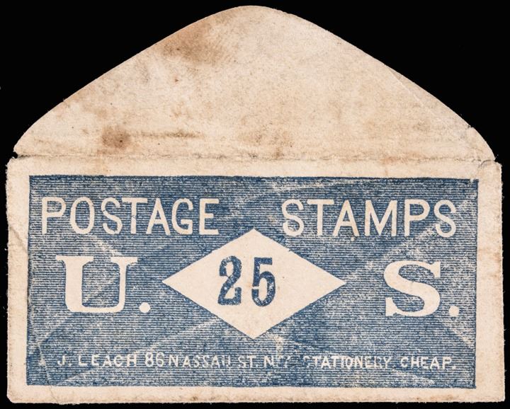 M. Friedberg PE423. Printed in blue on white paper stock: “POSTAGE STAMPS US, J. LEACH, 86 Nassau St, NY, Stationery Cheap.” The number “25” appears printed in blue within a white diamond at center. The left end of the face has a short tear and there is a trivial split at the left edge of the flap with some light scattered tone. The envelope is fully complete. This is the Leach variety printed in blue on white paper with the denomination in a white diamond, the minor sub-variety with the narrow typestyle “25”. Very scarce being whole and complete. Listed value at $1,800 in Friedberg. See: “Civil War Stamp Envelopes, the Issuers and Their Times” by Fred Reed.