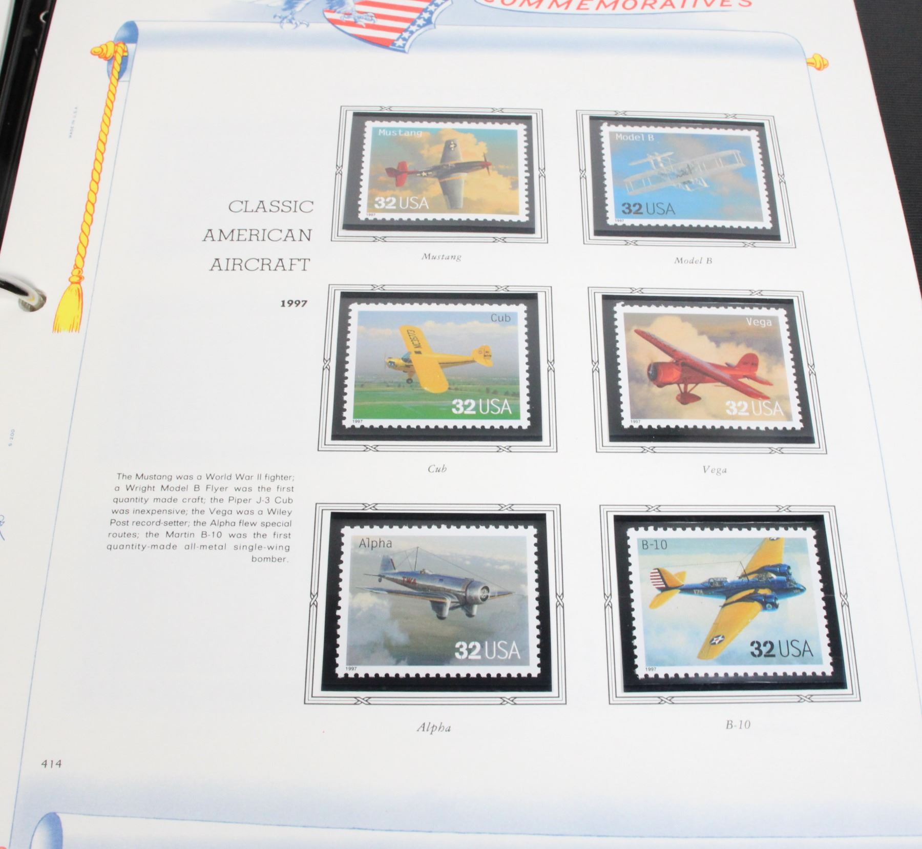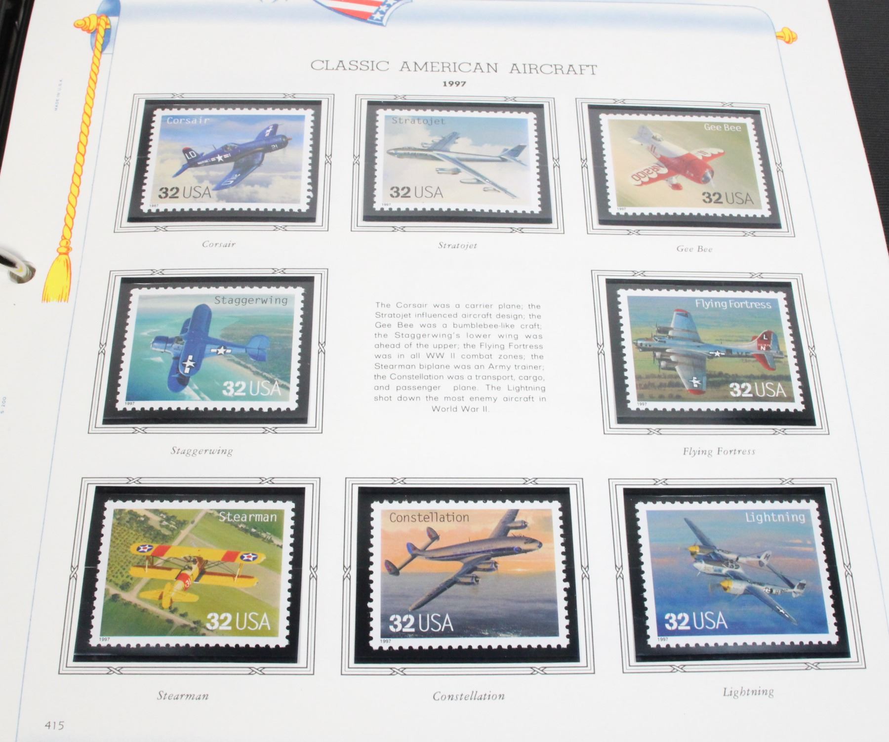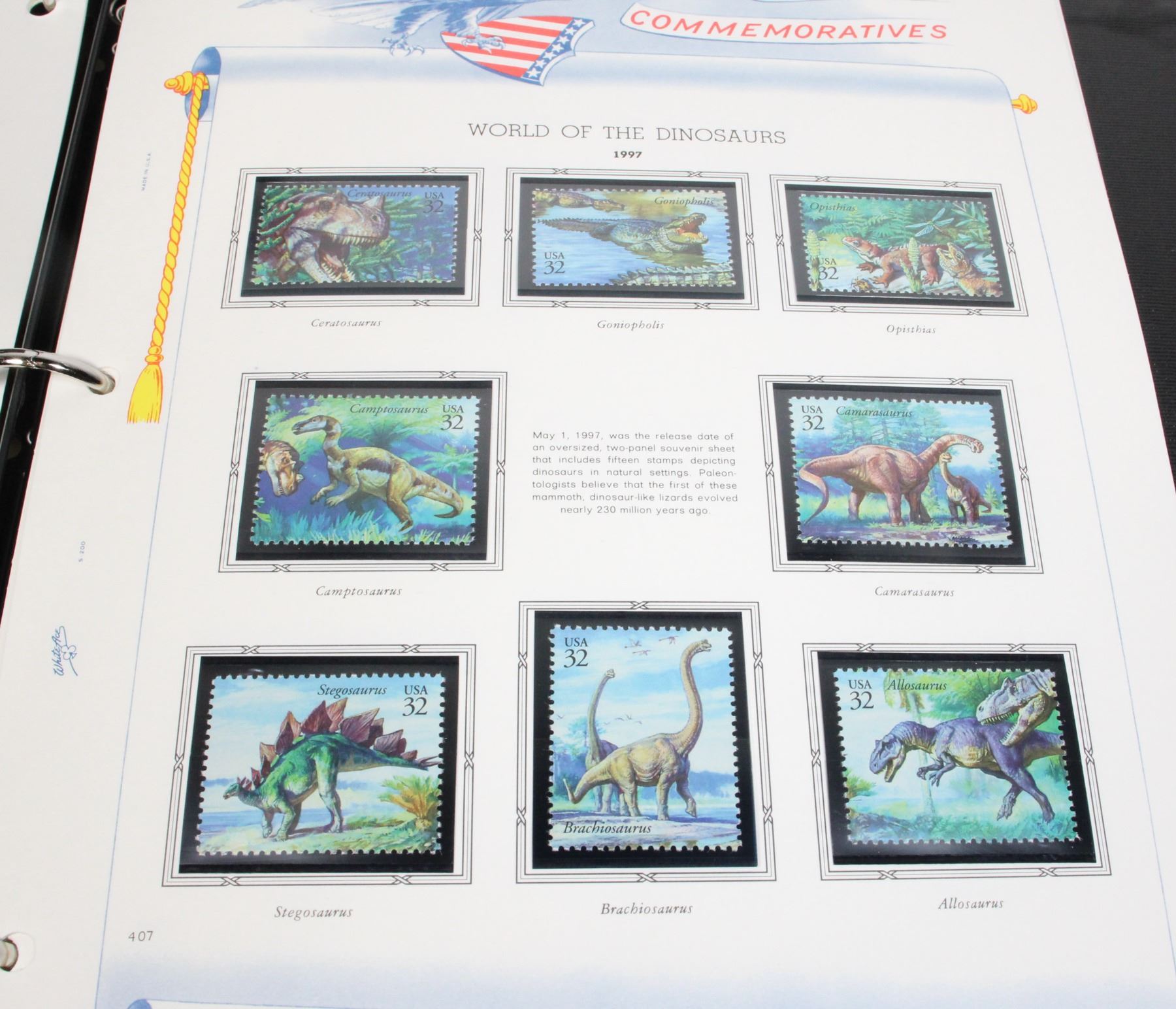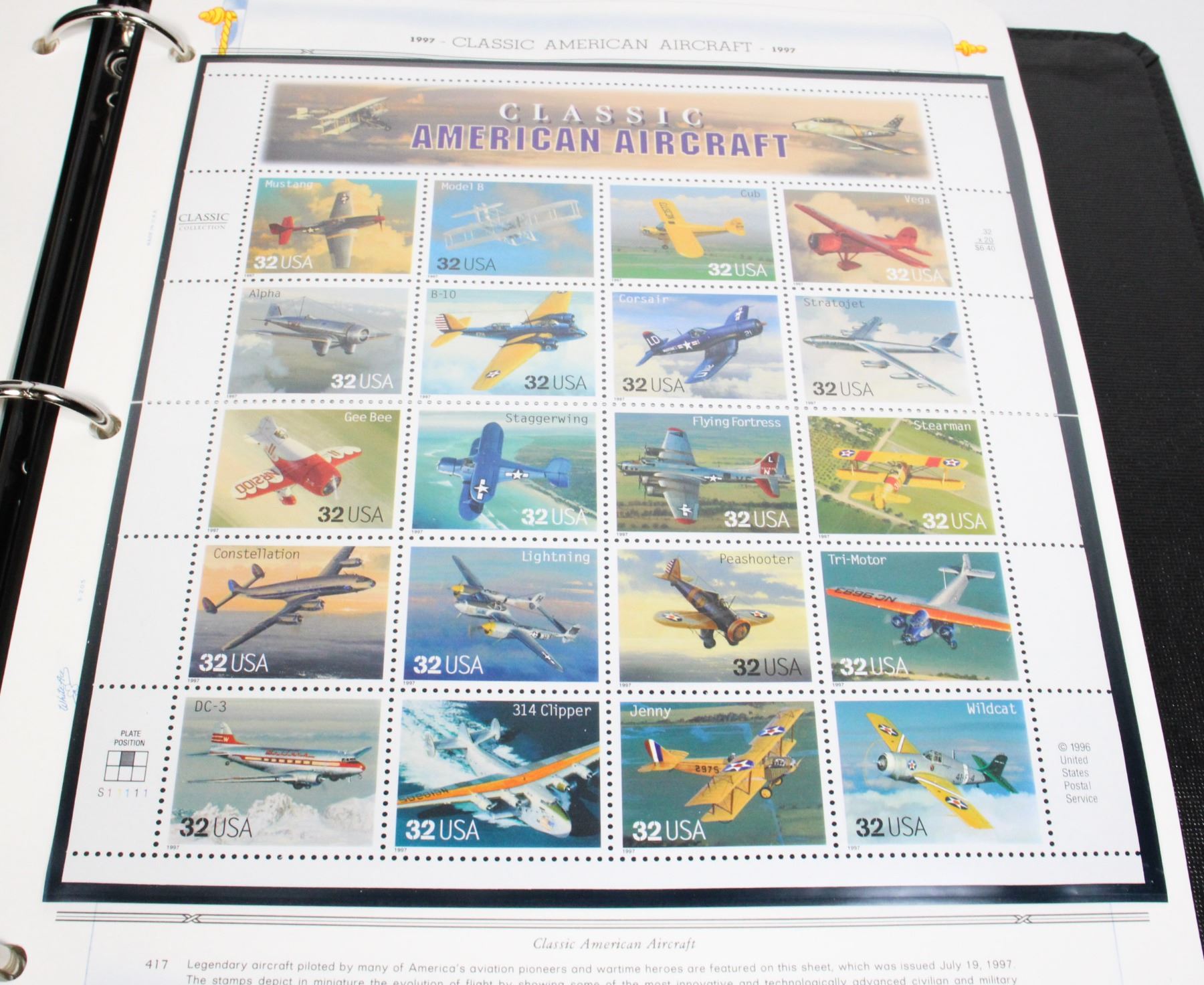 COLLECTION IN PROFESSIONAL WHITE ACE STAMP ALBUM. NOT COMPLETE BUT MANY STAMPS. SOME INCLUDE WORLD OF THE DINOSAURS 1997, CLASSIC AMERICAN AIRCRAFT 1997, FOLK MUSICIANS 1998, AND MANY MORE