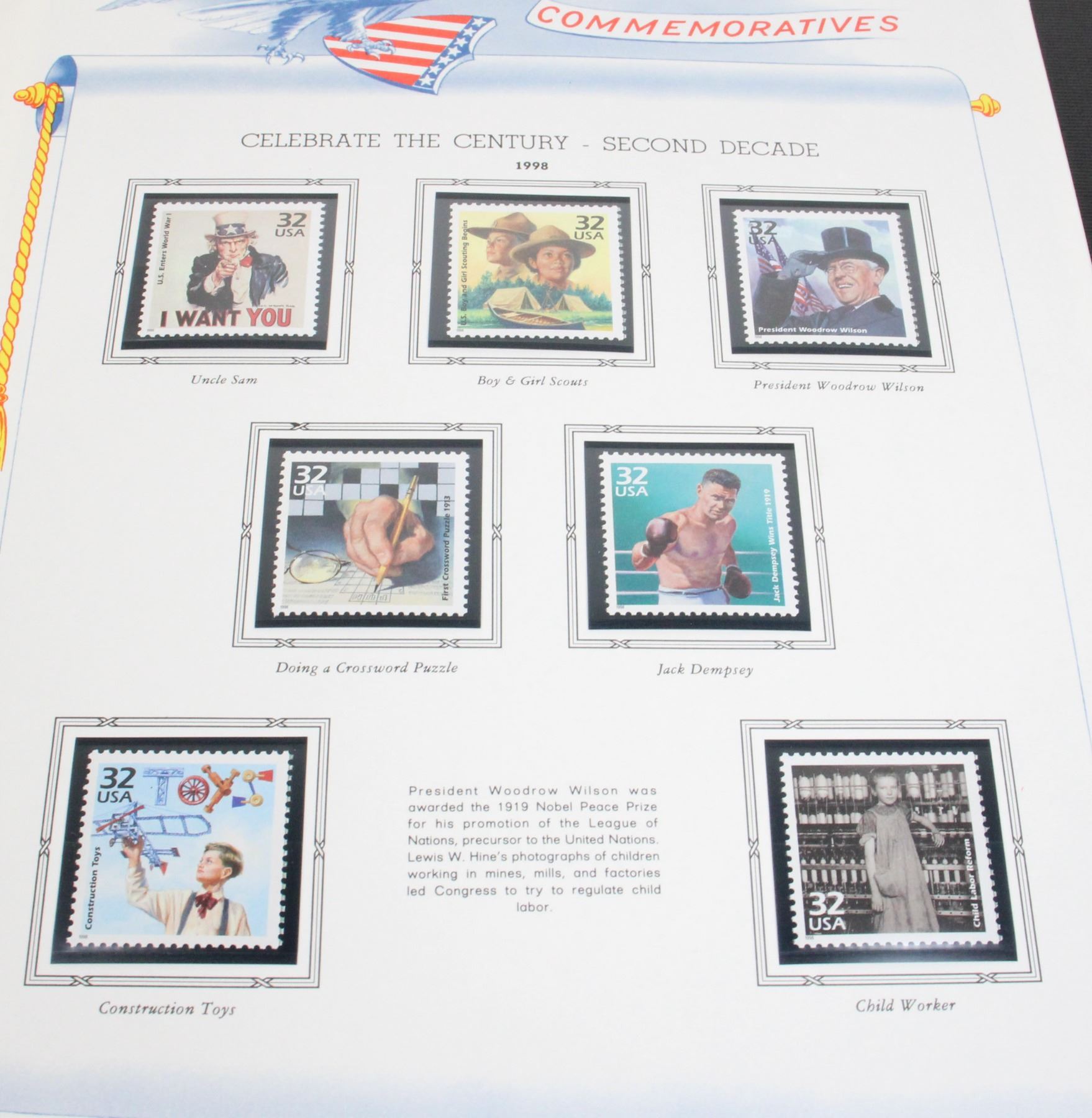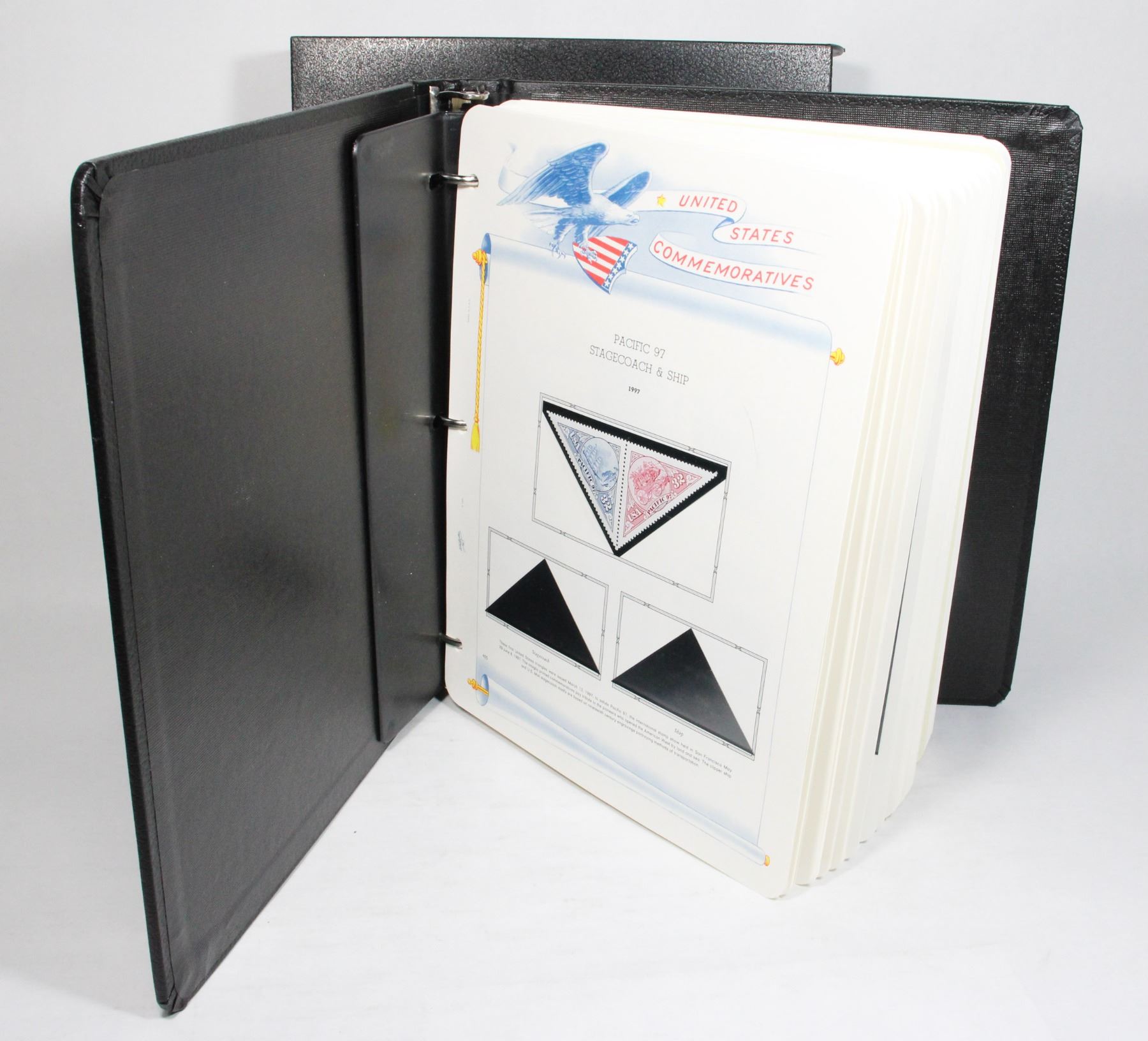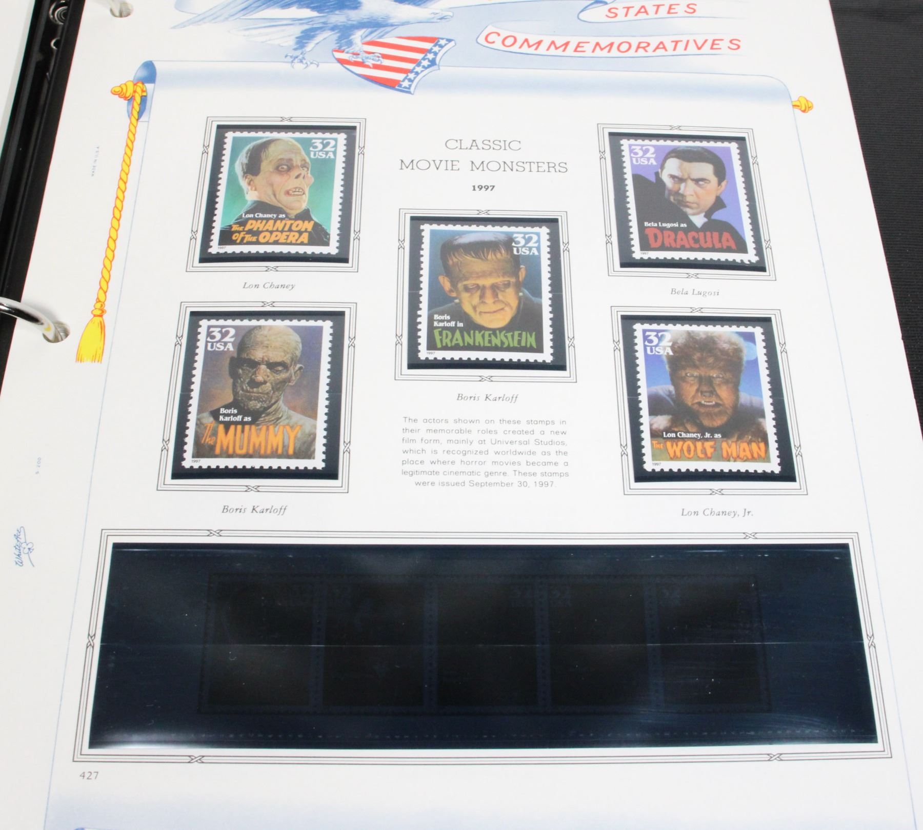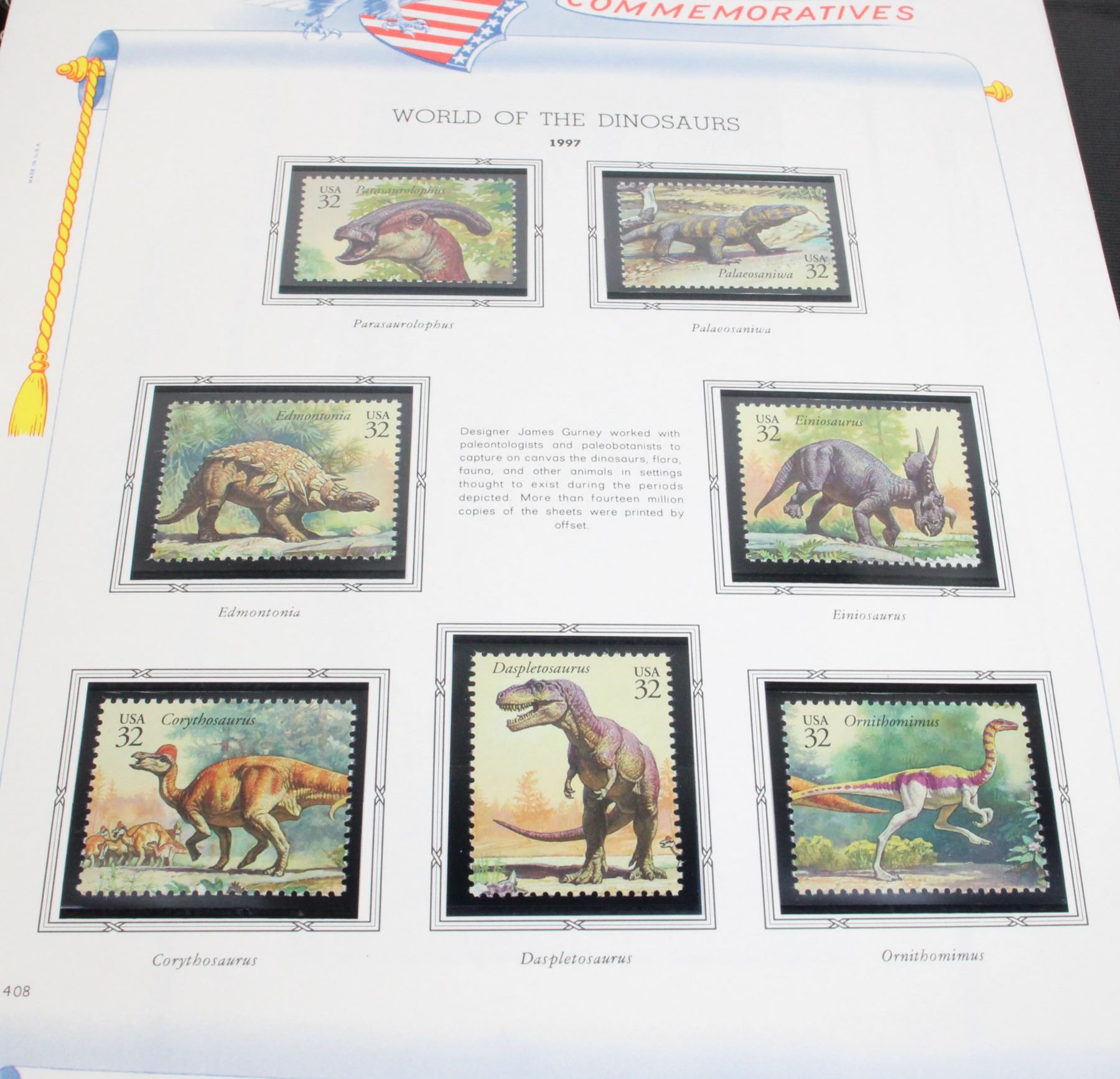 COLLECTION IN PROFESSIONAL WHITE ACE STAMP ALBUM. NOT COMPLETE BUT MANY STAMPS. SOME INCLUDE WORLD OF THE DINOSAURS 1997, CLASSIC AMERICAN AIRCRAFT 1997, FOLK MUSICIANS 1998, AND MANY MORE
