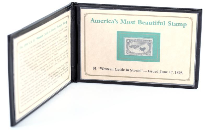 $1 "Western Cattle In Storm" issued June 17, 1898. Stamp is packaged within a Postal Commemorative Society presentation case. Overall in very good condition.