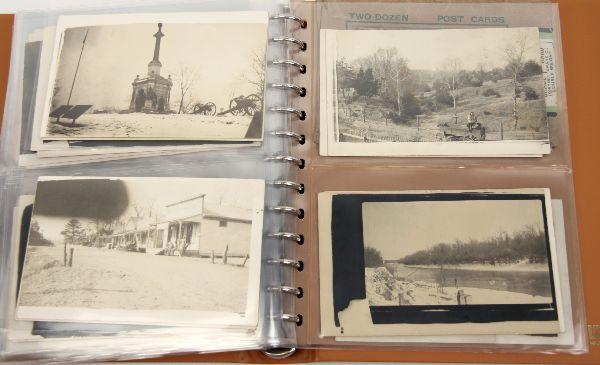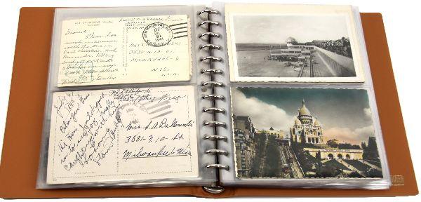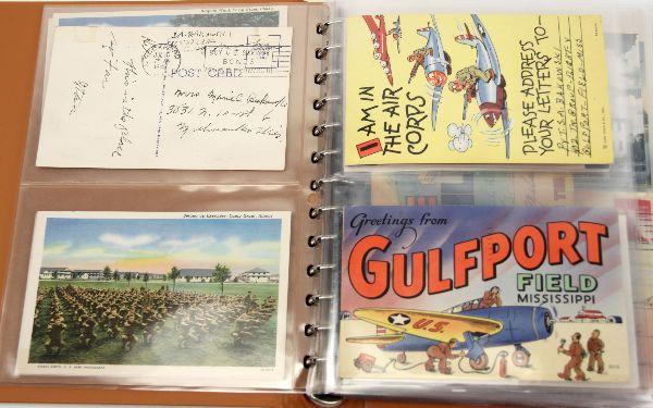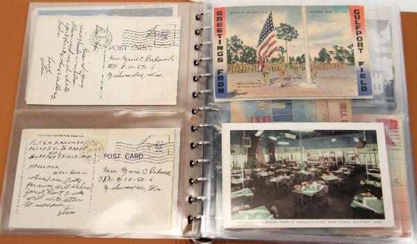 A well cared for postcard collection of over 100 postcards, about 10% are WWII military cards the balance are U.S. and foreign scenes. In the back of the binder there are 30 early pre war U.S. southern pictorials. Condition very good.