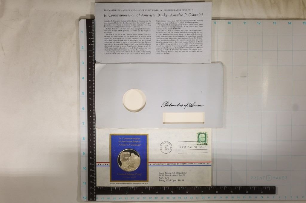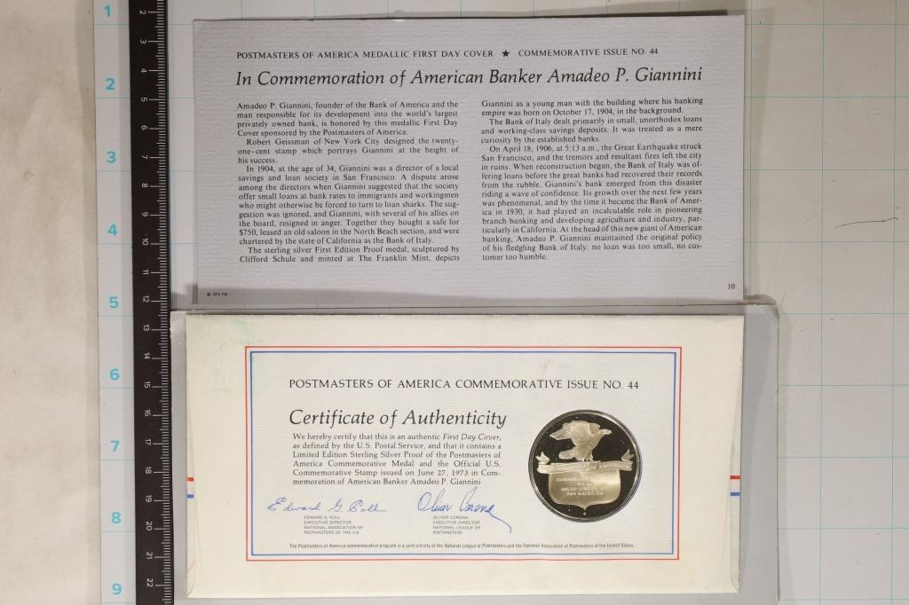 AMERICAN BANKER AMADEO P. GIANNINI, PROOF, IN FDC FROM JUNE 27TH, 1973. HAS OUTER ENVELOPE AND INFO SHEET