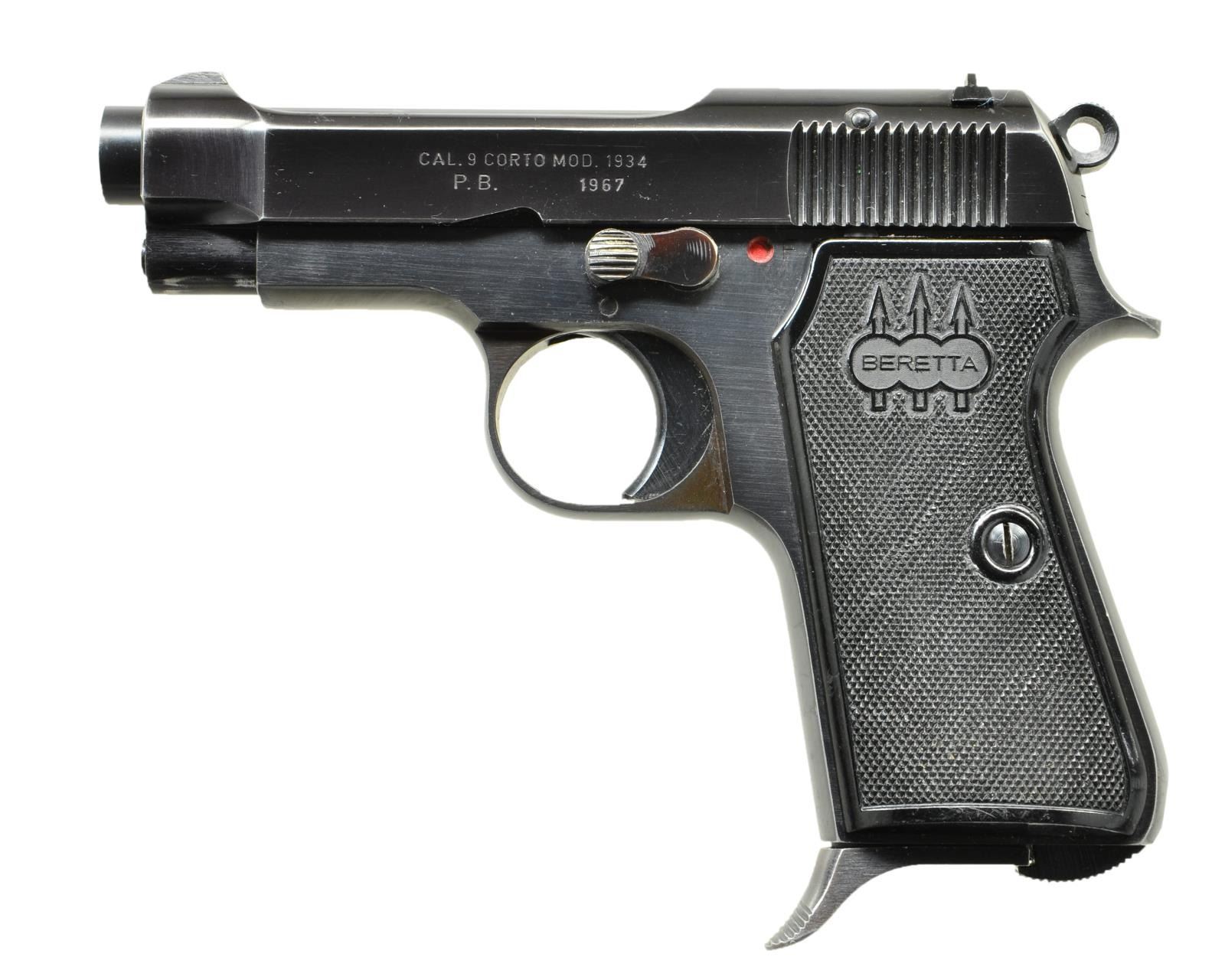 Cal. 9mm Kurz (380 ACP). S #F54732. Bbl. 3 3/8". Right side of frame has S # w/ white highlight. Right side of slide marked "PIETRO BERETTA/MADE IN ITALY". Left side of slide marked "CAL.9 CORTO MOD. 1934/P.B. 1967". Checkered plastic grips w/ three vertical arrows and Beretta marking. MAGS: 1-7 rd. marked "Cal. 9 Corto P.B.". UNATTACHED ACCESSORIES: aftermarket brown cardboard box w/ end label handwritten numbered to pistol. CONDITION: grips show light handling wear. Metal retains 95% original blue w/ some light silvering on both straps. Very good bore. (22-3571/MJC). CURIO. $300-500.