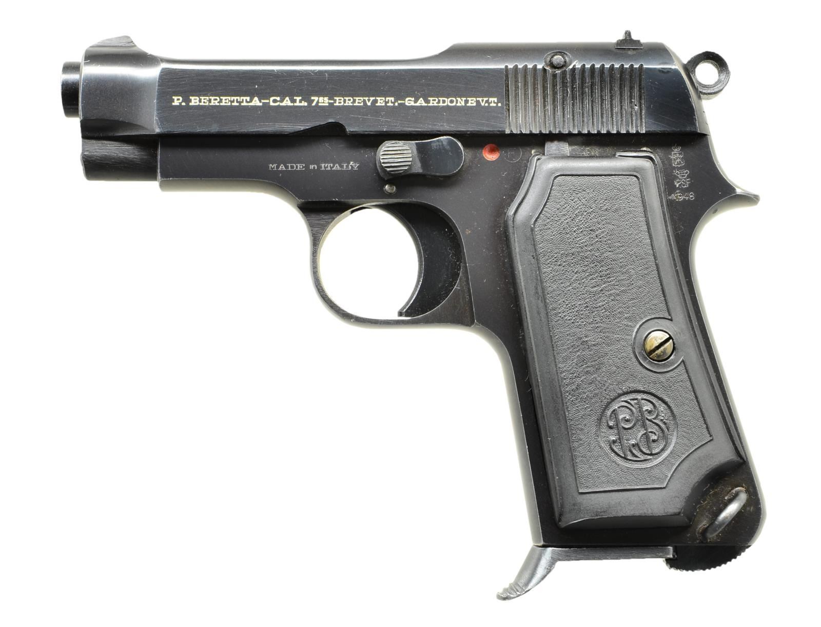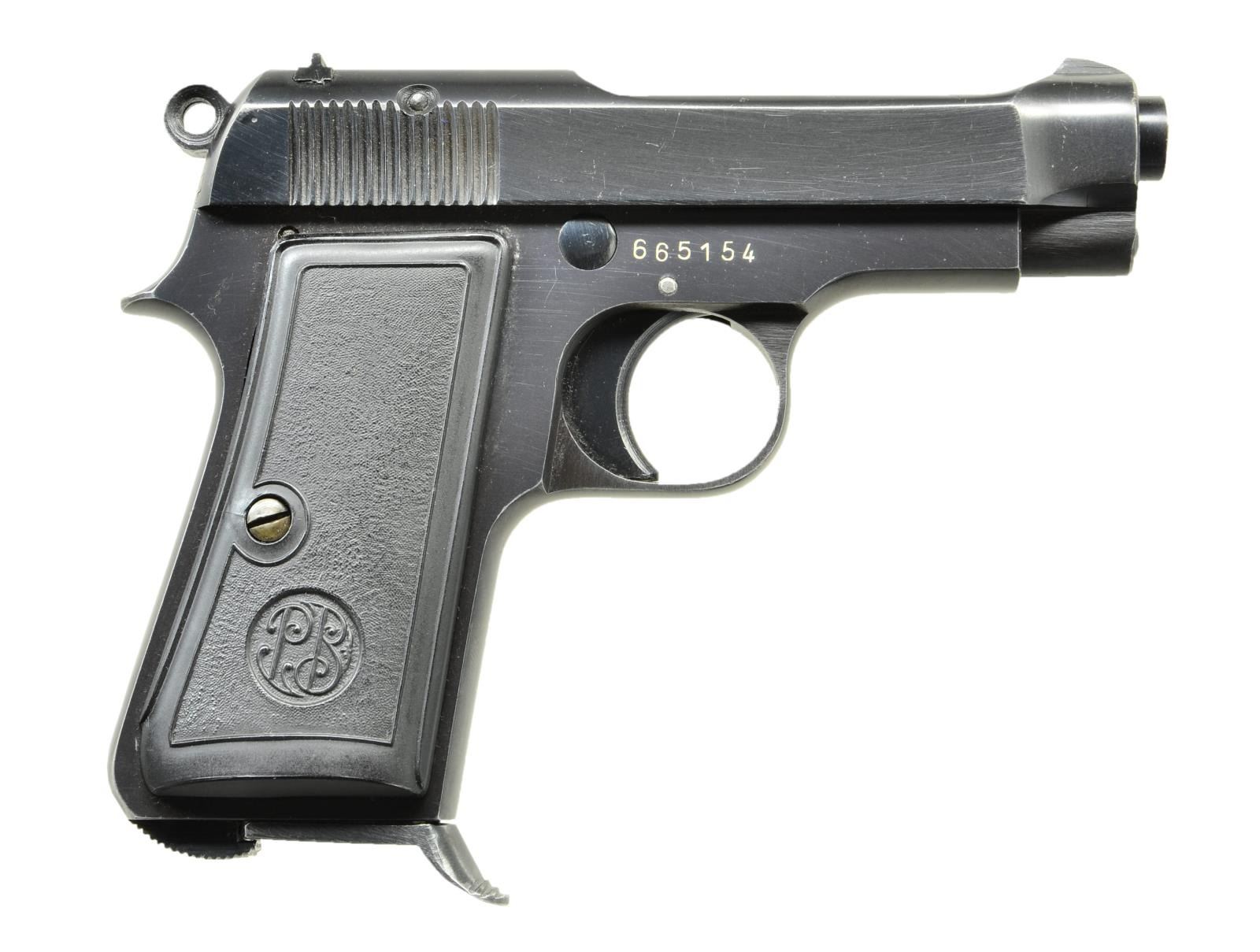 Cal. 7.65mm (32 ACP). S #665154. Bbl. 3 3/8". Right side of frame has S # w/ white highlight. Right side of frame has "MADE IN ITALY" marking. Right rear has Italian proofs and 1948 date. Right side of slide has single line Beretta marking. PB marked black plastic grips. Grips have a loose fit. MAGS: 1-8 rd. marked "Cal. 7.65 BERETTA" on spine. CONDITION: grips show light handling wear. Metal retains 95% original blue w/ a couple small spots of freckling on top of slide and some light high edge wear. Near excellent bore. (22-3552/MJC). CURIO. $300-500.