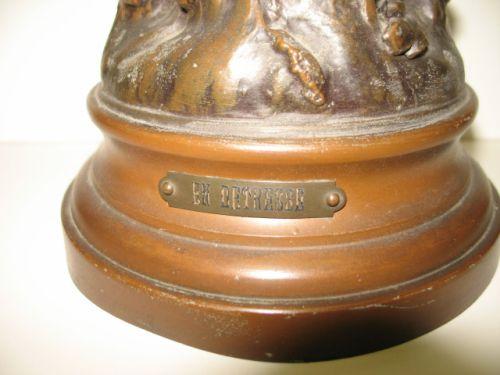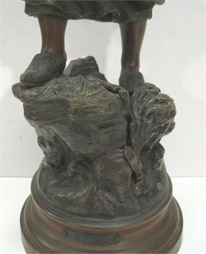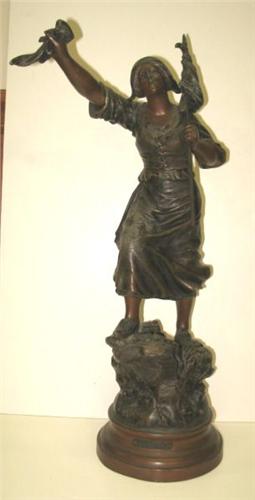 POT METAL STATUE. Depicts a French Revolution era female walking with a sash in right hand and flag in the left. Base is marked with plate that reads “En Détresse”. 22.5” H to top of right hand (flag can be removed from left hand).