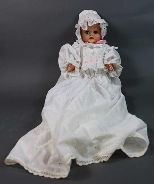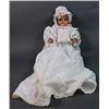 - a porcelain headed doll with sleepy eyes, wearing a cotton dress.