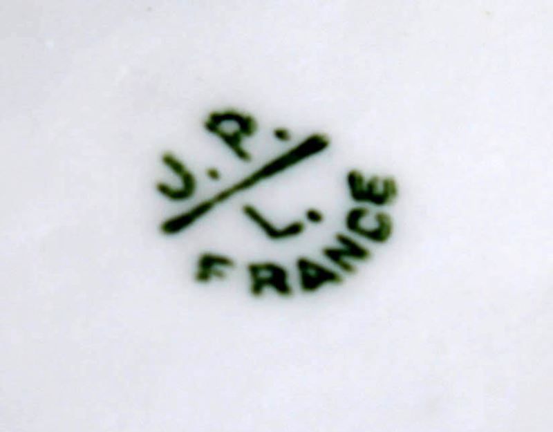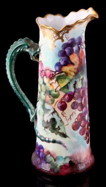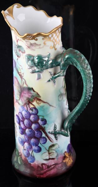 Pouyat Limoges JPL France tankard with green dragon handle and portrait of a bundle of grapes. Approximately 14.625 inches tall, some wear to its base; overall in very good condition.
