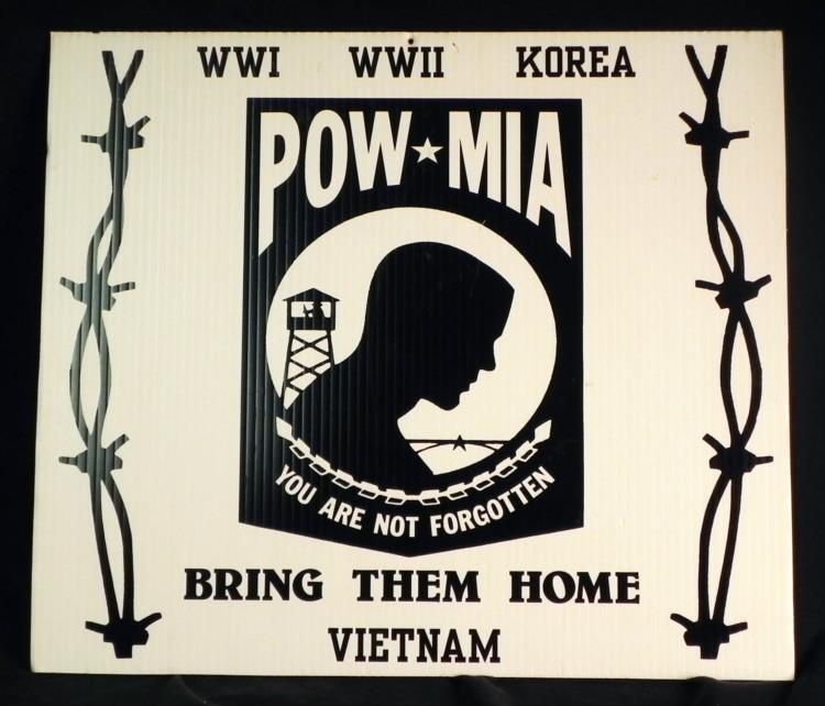Here is this Plastic Board with the words POW (Prisoner of War) and MIA (Missing in Action) on it. It is 16" x 18".
