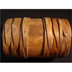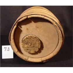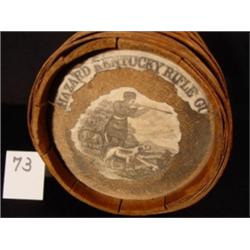 8" tall by 5 1/2" diameter Powder keg, banded wood slats with bands splint? 3 each top and bottom, label on bottom (partially gone) says, "Hazard Kentucky Rifle Co." Top has cork (original?) and old nails.