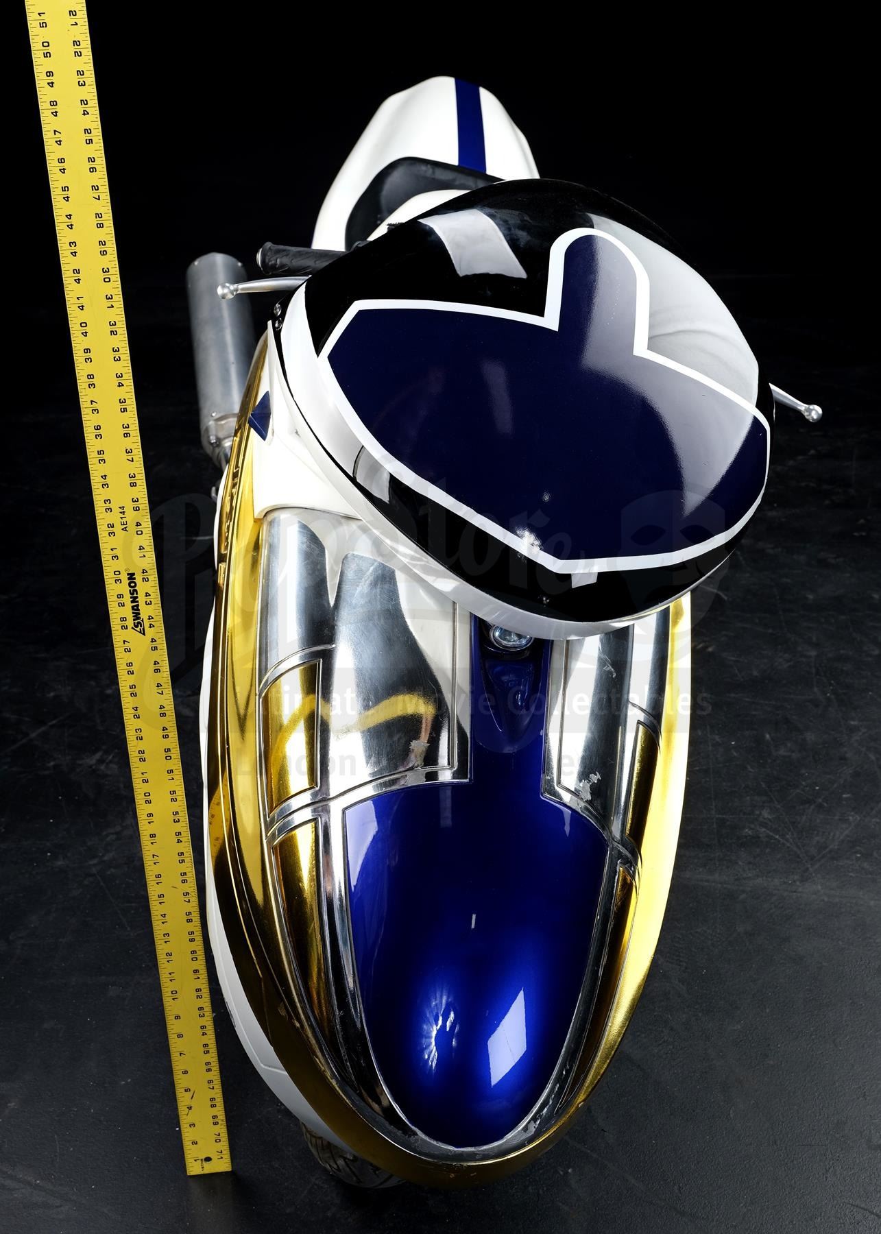 A full-size Blue Vector Cycle from the children's action series Power Rangers Time Force. Lucas Kendall (Michael Copon), the Blue Time Force Ranger, and his teammates rode their Vector Cycles whenever they needed to move quickly from place to place on the ground level, a task not suited to their hover vehicles.