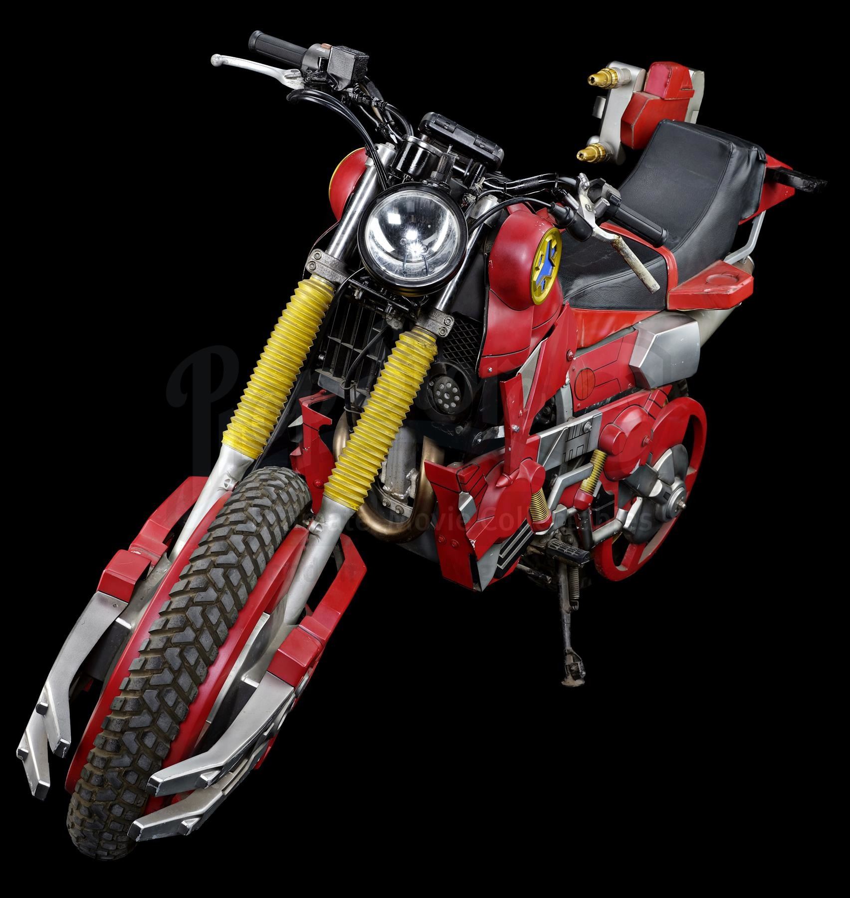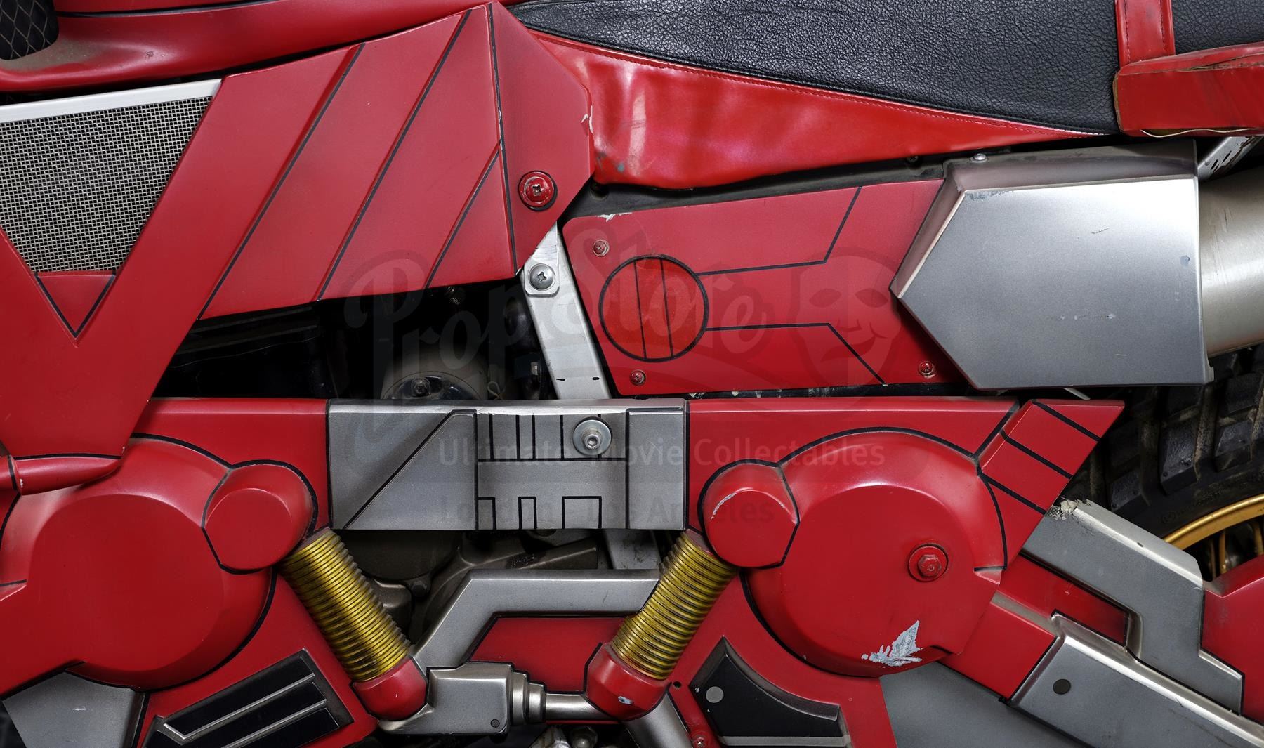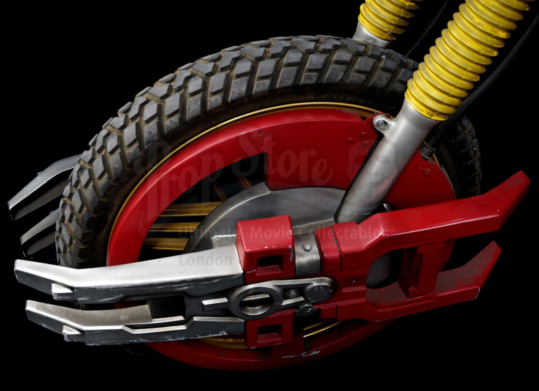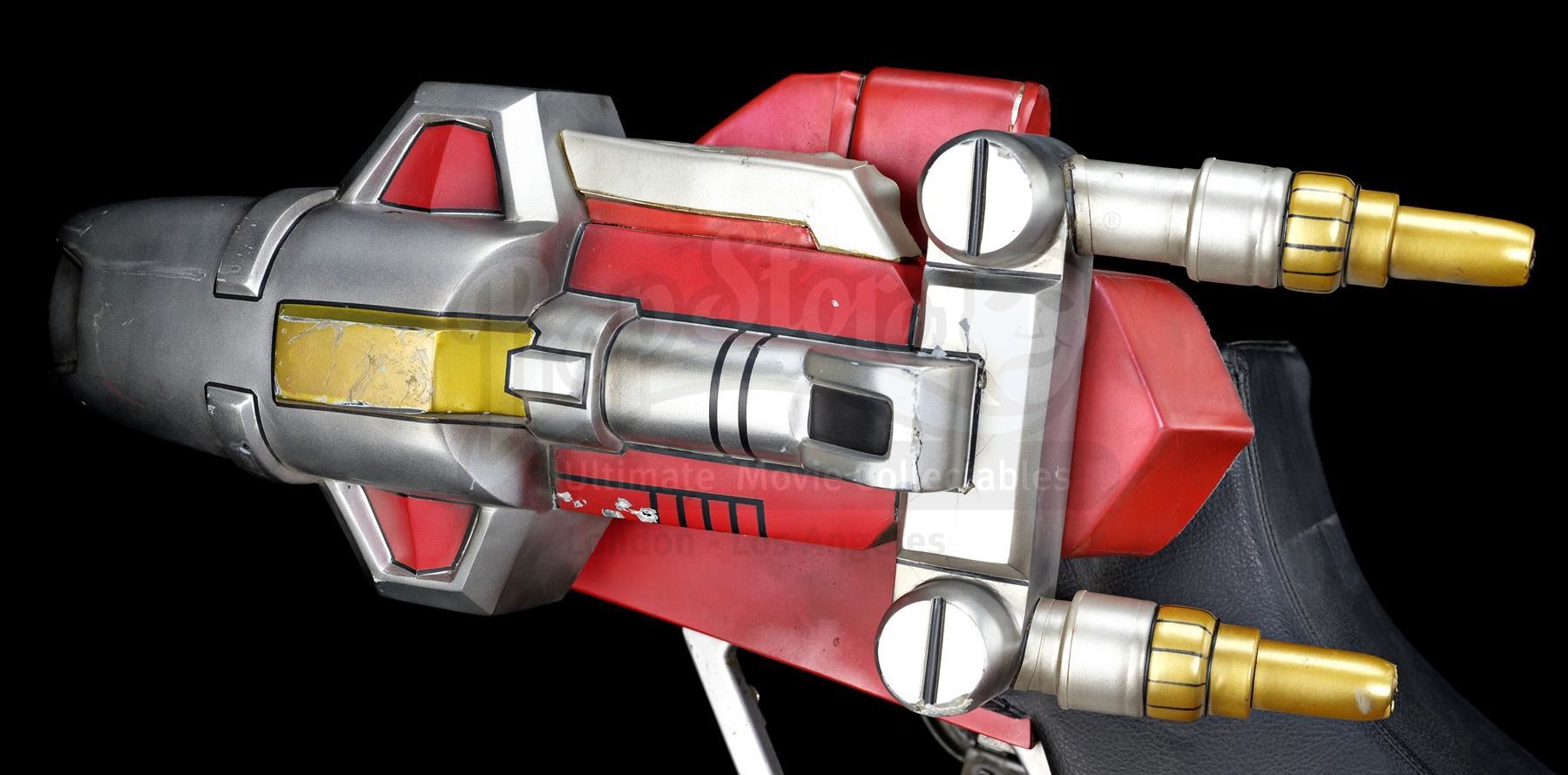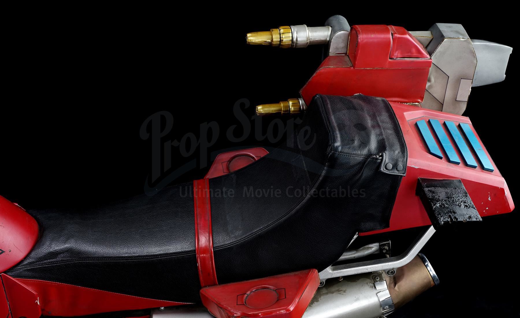 This custom-made full-size prop Strata Cycle consists of a red body with silver highlights and black elements on the underside, all constructed in fiberglass. It has orange lights on the front and sides, and red taillights. The Strata Cycle, being a hoverbike (nonfunctioning), has no wheels and is mounted to a metal effects rig. The Strata Cycle has had some restoration to cracks and finish, though does still exhibit original production wear as well as a damaged tail light that is loose in place, some wiring visible near the base (original electronic functionality is unknown), and the small extendable wings in the back are loose. Dimensions: 274.5 cm x 91.5 cm x 167.75 cm (108" x 36" x 66")