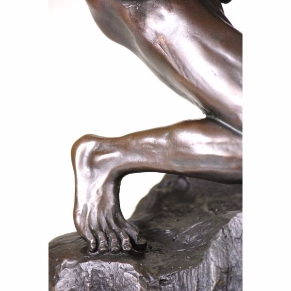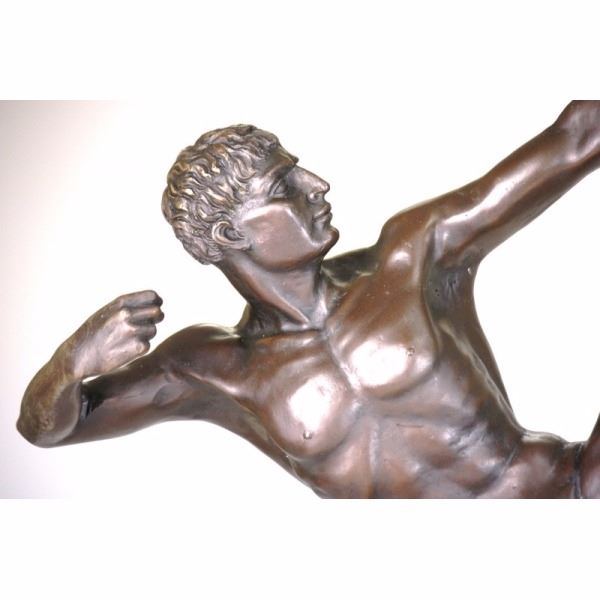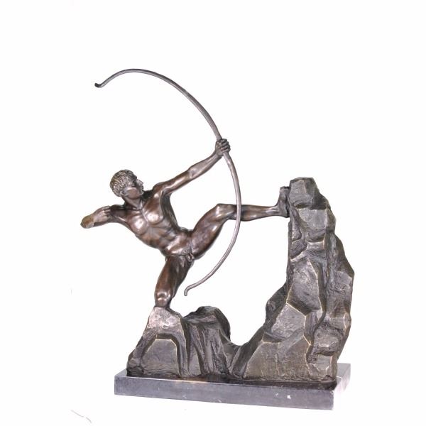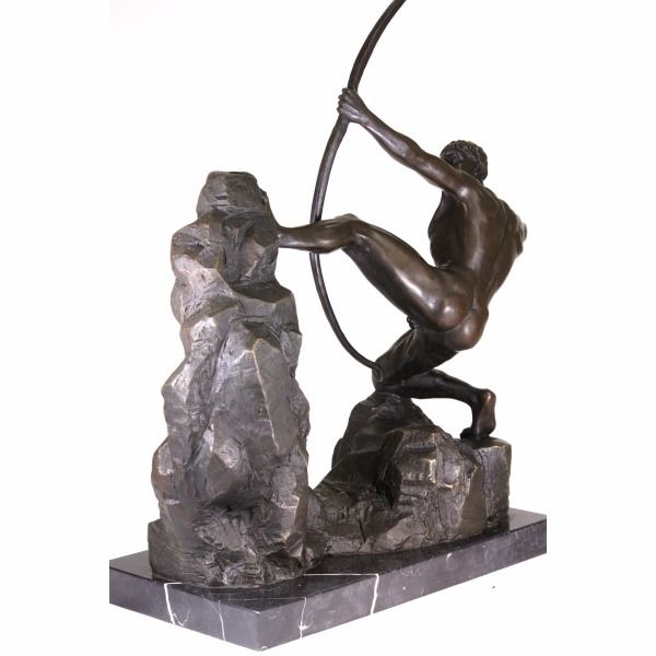True to the essence of the ART DECO STYLE this piece was originally created by French master J. de Roncourt in the 1930s. Entitled "Le Bendeur", it depicts a powerful man holding a bow rod by hand. A copy of this bronze was used to grace the desk of "Victor von Doom" in the movie, "Fantastic Four". The quality of this refined art is rarely found in re-casted bronzes except here. Casted in the Europe and mounted on a marble base, this bronze measures 245" high by 20" wide by 9" deep.This bronze statue is handmade and cast in the traditional Lost Wax Casting Process. This insures a quality bronze sculpture that may be passed down from generation to generation. This statue will be very visible in any room and sure to be an eye catcher. Whether inside or outside, this bronze statue will be a great addition to any home. Condition:This sculpture is in a very good condition. Bronze Dimensions with Marble Base:Height 24 1/2" x Width 20"Marble Dimensions: 16" X 9 ".Height without base: 23 " Weight : 40 LBSInventory:15190B14951 True to the essence of the ART DECO STYLE this piece was originally created by French master J. de Roncourt in the 1930s. Entitled "Le Bendeur", it depicts a powerful man holding a bow rod by hand. A copy of this bronze was used to grace the desk of "Victor von Doom" in the movie, "Fantastic Four". The quality of this