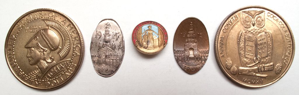 Lot 5 Pan Pacific Exposition medals, so-called dollars and 2 flattened penny souvenirs from the 1915 Exposition in San Francisco. Bill Weber CollectionCity: San FranciscoCounty: State: CADate: