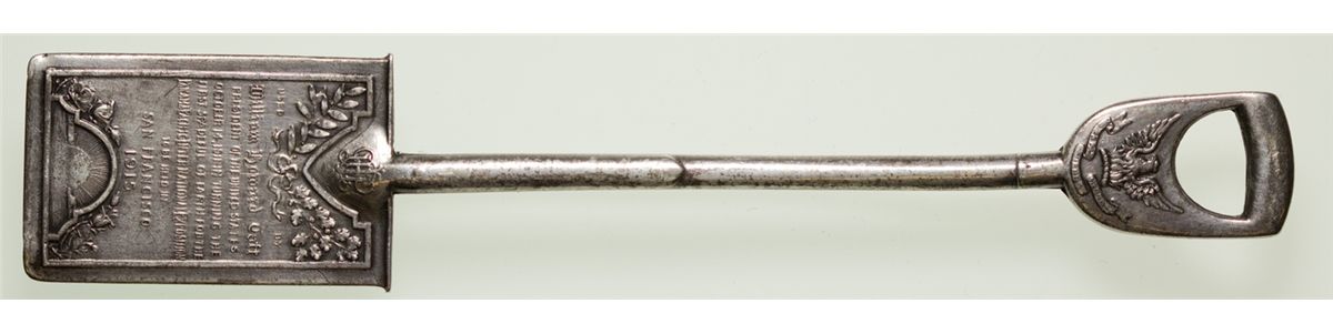 Inscribed "used by William Howard Taft President of the United States, October 14, 1911 turning the first spadeful of Earth for the Pan Pacific International Exposition to be held in San Francisco 1915. 4 inches tall, rare pinback intact stamped Shreve and Co. Sterling Silver. -60375