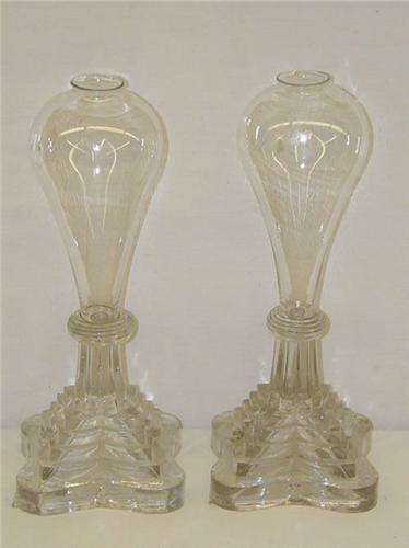 PR. 10 1/2" SANDWICH GLASS OIL LAMPS-CLEAR LIGHT BULB FONTS ON STEPPED BASE - BASE RIM ROUGHNESS