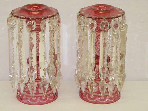 PR. 11" CRANBERRY CUT TO CLEAR MANTLE LUSTRES W/ LONG CUT PRISMS - (1) W/ SMALL CHIP TO BASE RIM, MISSING 1 PRISM