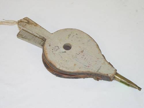 PR. 11" MINIATURE PAINTED WOODEN BELLOWS W/ OLDER GREY PAINT - DENTS TO BRASS TIP, LOSSES TO LEATHER & PAINT;