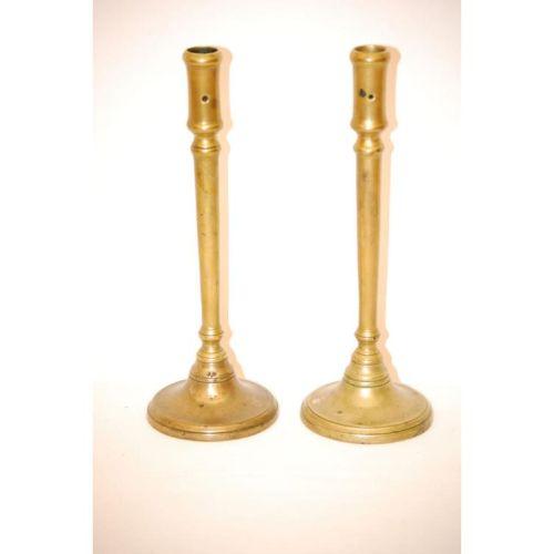 PR. 12" EARLY BRASS CANDLESTICKS - CONTINENTAL W/ DEEP CANDLE CUPS, TURNED TAPERED SHAFTS & ROUND TURNED BASES(18TH-19TH CENT.)(12" T X 4 1/4" W) - WEAR, IMPERFECTIONS