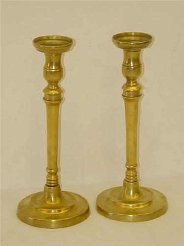 PR. 18TH CENT. BRASS CANDLESTICKS-HEAVY TURNED BRASS W/ DEEP CUPS & BOBECHE & SCREW ON BASES (PROBABLY ENGLISH; 11 3/4" T X 4 7/8" W) - WEAR, REPAIRS & IMPERFECTIONS;
