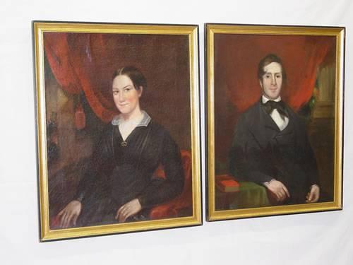 PR. 19TH CENT. AMERICAN SCHOOL OIL ON CANVAS ANCESTORAL PORTRAITS OF A YOUTHFUL COUPLE (40" X 36")- RELINED W/ CRACKLEATURE and RESTORATIONS;