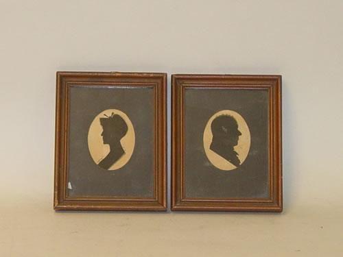 PR. 19TH CENT. HOLLOW CUT PAPER SILHOUETTES: (1) MALE MARKED "SMITH ON BACK & (1) FEMALE-UNMARKED, BOTH OVAL MATTED & SQUARE MOLDED WOODEN FRAMES (7 1/8" X 5 3/4") - TONING & IMPERFECTIONS