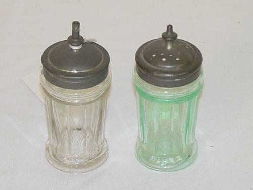 PR. 3 3/4" TALL SANDWICH PANELED CHRISTMAS SALTS W/ PEWTER LIDS: (1) CLEAR & (1) GREEN - MISSING AGITATORS, WEAR TO LIDS;