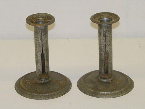 PR. 5" EARLY TIN PUSH-UP HOGSCRAPER CANDLESTICKS - NORMAL WEAR