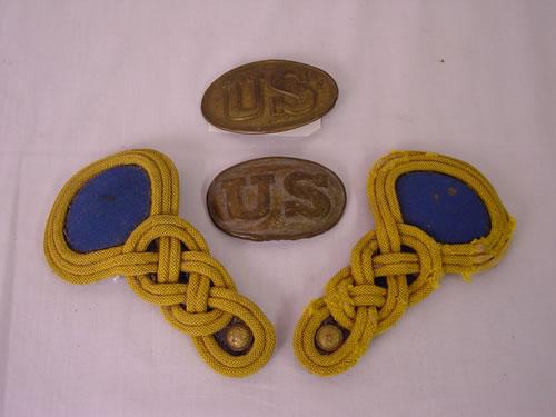PR. 6 1/2" MID 19TH CENT. EPPELETS GOLD TRIMMING OVER BLUE WOOL W/ BRASS BUTTON W/ FULL SPREAD EAGLE (POSSIBLY CIVIL WAR) TOGETHER W/ (2) 19TH CENT. U.S. BRASS BELT BUCKLES-(1) 3 2/8" & (1) 3 1/2" - NORMAL WEAR & IMPERFECTIONS