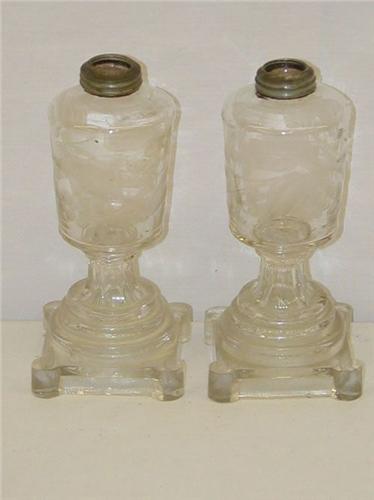 PR. 6 1/2" SANDWICH CLEAR FLUID LAMPS W/ CUT & FROSTED DESIGN ON STEPPED BASE & PEWTER COLLARS - BASE RIM ROUGHNESS