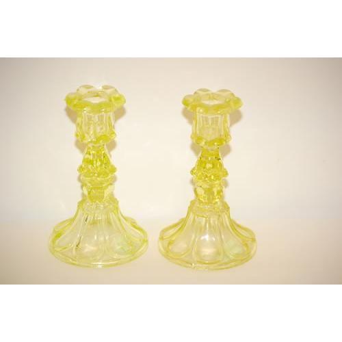 PR. 7" CANARY SANDWICH GLASS CANDLESTICKS-BOSTON & SANDWICH GLASS CO., PETAL & LOOP PATTERN - RIM CHIPS & MINOR FLAW NEAR BASE OF STEM