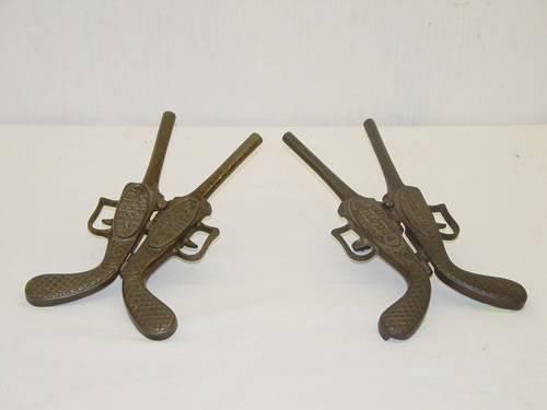PR. 8 1/4" CAST IRON ADVERTISING PISTOL FORM BOOT JACKS - OUR SHOES THE BEST PHILADELPHIA and AMERICAN BULLDOG - WEAR;
