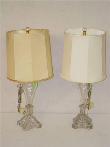 PR. 9 1/2" CLEAR SANDWICH OIL LAMPS W/ STEPPED BASE - BASE RIM CHIPS & FLAWS IN MAKING (FITTED FOR LAMPS);