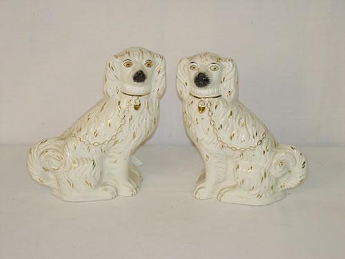 PR. 9 1/2" STAFFORDSHIRE WHITE SPANIELS W/ GOLD DECORATION MARKED ON BOTTOM STAFFORDSHIRE WARE KENT MADE IN ENGLAND - GOLD WEAR