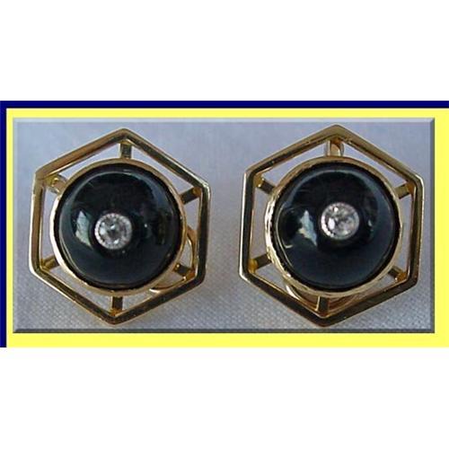 Hexagonal shaped with radiating bars from a central gold circle set with a cabochon onyx stone, rising high out of the gold setting and containing a diamond in the center.Backs have firm Omega clips. A floral pad on the back is embossed with "9CT GOLD". Very good, original condition.